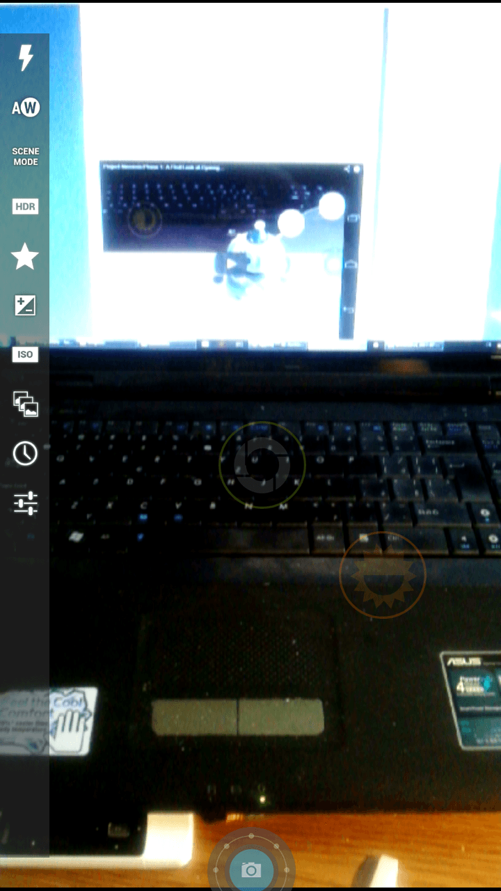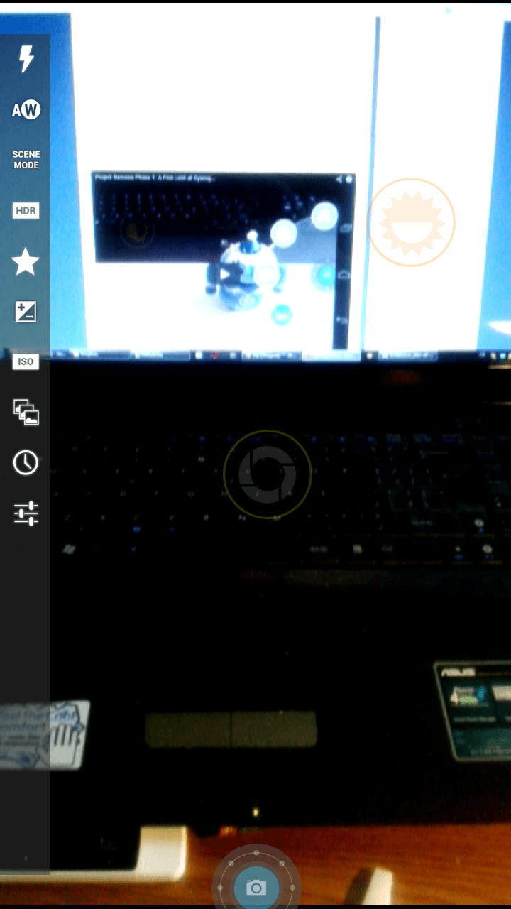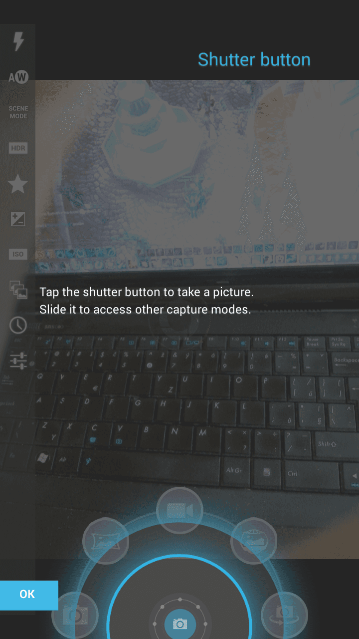 V levém sloupci je seznam režimů snímání – Photosphere, panorama, video a klasický fotoaparát, pod kroužkem v pravém rohu se skrývají nastavení blesku, teploty barev, aktivace přední kamerky a ztmavení či zesvětlení. O úroveň níž je ještě možnost změnit velikost fotografií nebo volba scénického režimu (automaticky, akce, noc, západ slunce). Tato aplikace umožňuje klepnutím prstu nastavit bod pro zaostření.