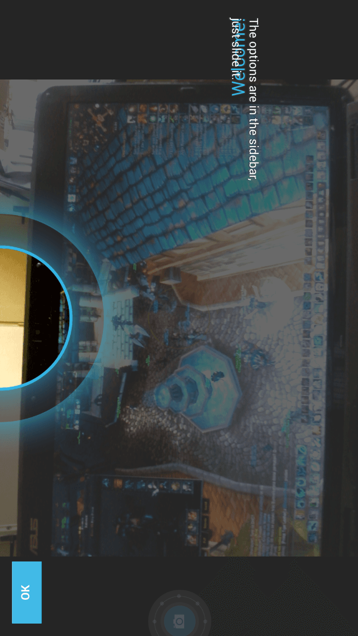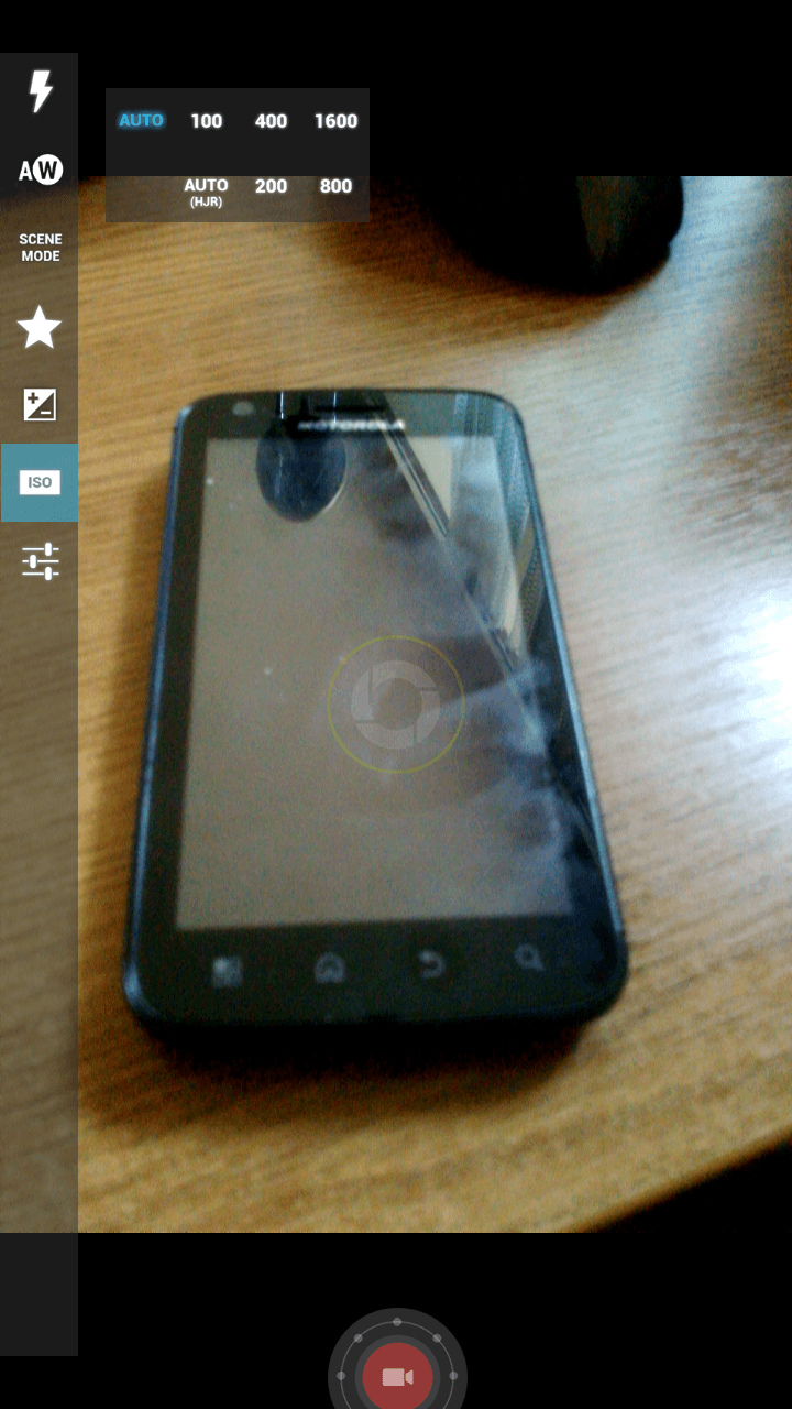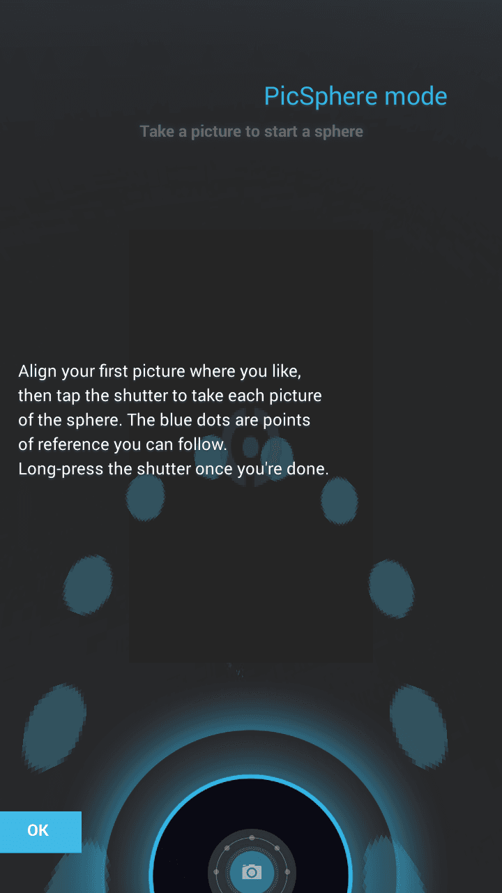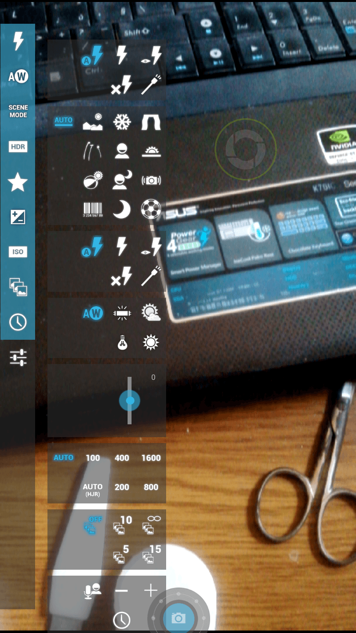 V levém sloupci je seznam režimů snímání – Photosphere, panorama, video a klasický fotoaparát, pod kroužkem v pravém rohu se skrývají nastavení blesku, teploty barev, aktivace přední kamerky a ztmavení či zesvětlení. O úroveň níž je ještě možnost změnit velikost fotografií nebo volba scénického režimu (automaticky, akce, noc, západ slunce). Tato aplikace umožňuje klepnutím prstu nastavit bod pro zaostření.