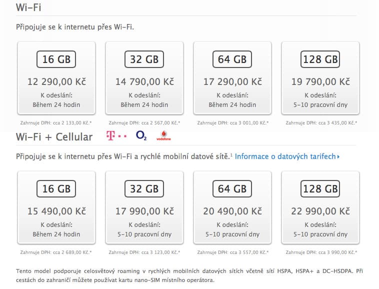 iPad Air je k dispozici jak u různých prodejců, tak na obchodě Applu, kde je aktuálně stále do 24 hodin dostupná veškerá konfigurace, pouze o verze s mobilním připojení a větší vnitřní pamětí je větší zájem a mizí tak rychleji, takže se dostupnost protahuje z jednoho dne na zhruba 5-10 pracovních dnů. To je ale ještě dobré.
