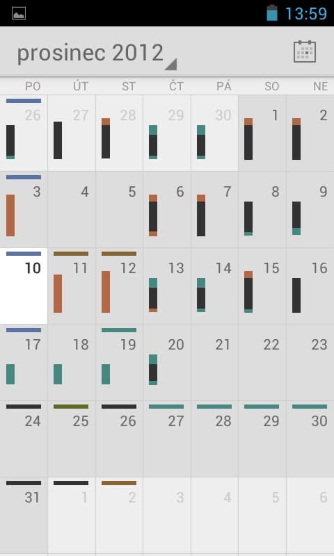 Jak denní, tak týdenní zobrazení zobrazuje pouze 6-ti hodinovou časovou osu, takže je nutné po daném dnu / týdnu rolovat neustále nahoru a dolů, abychom žádnou schůzku nepřehlédli. Měsíční náhled v každém dnu zobrazuje jeden sloupec, který je vyplněn barvami kalendářů, dle toho, jak moc z vašeho času daný den ukrajují. Moc přehledné to není, rozhodně ale lepší než jedna tečka, či trojúhelníček, jak to mají ve zvyku někteří jiní výrobci. Úkoly kalendář v FX400 neumí, zde tedy bude nutné z Google Play doinstalovat k tomu určenou aplikaci.