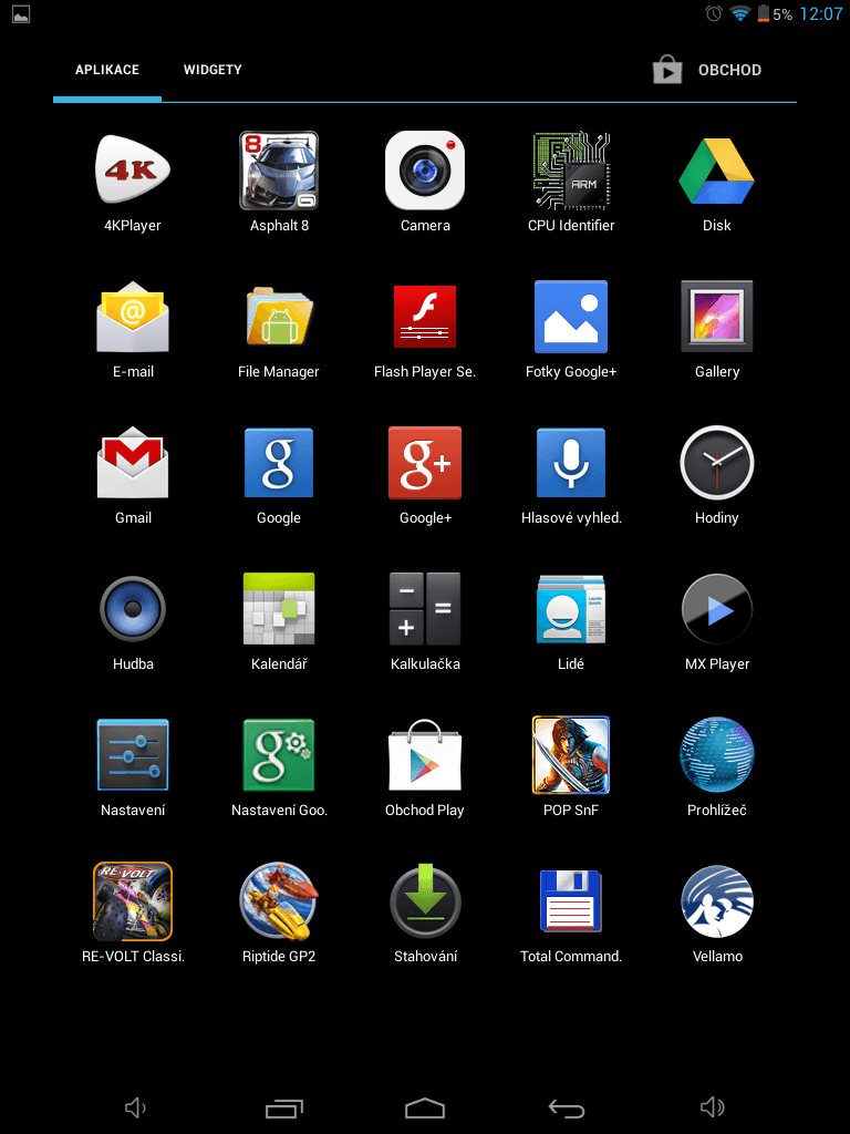 Po vstupu do menu aplikací se zobrazí všechny aplikace bez možnosti filtru v mřížce 5×6, tedy 30 na jedné obrazovce. Buď použitím ikony v horní části, nebo pohybem doprava, se lze dostat do menu widgetů, kde jsou přehledně zobrazeny. Taktéž zde nalezneme přímý přístup do Google Play. Výrobce se nicméně nijak nesnažil a tak kromě aplikace 4KPlayer pro přehrávání videí a souborového manažeru, nenahrál do tabletu zhola nic. Pokud tedy budete chtít používat Google+, Hudba Play, Chrome a další služby Googlu, budete si muset aplikace stáhnout z Google Play. Na druhou stranu, tablet není již z výroby plný bloadwaru a uživatel tak má svobodnou volbu si vybrat, co v něm chce a co ne. Začátečníkům spartanská výbava orientaci ale spíše znepřehlední.
