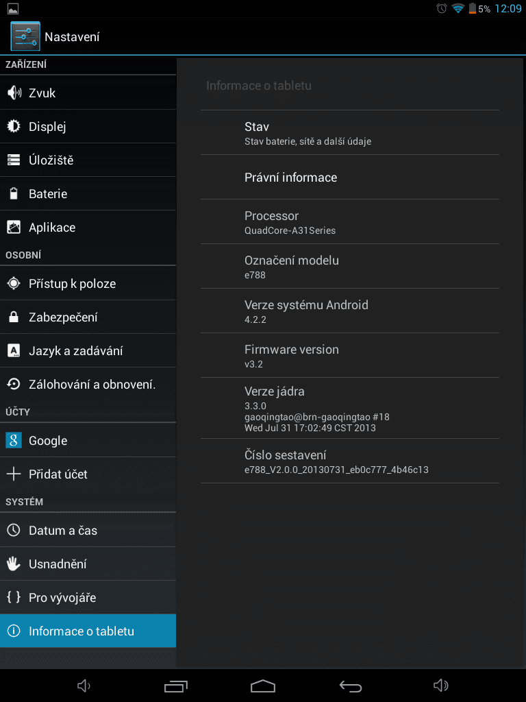 Nastavení tabletu se nese taktéž bez úprav, je zde tedy vertikálně rozdělená obrazovka , kdy v levé části jsou viditelné položky „bezdrátové sítě“, „zařízení“, „osobní“, „účty“ a „systém“, v pravé části následně detail jednotlivých voleb. Toto rozdělení mi přijde mnohem, mnohem přehlednější, než trend z poslední doby, kdy výrobci dávají dělící záložky na horní stranu nastavení, kde se jich vedle sebe použitelně vejde tak 3 -4 a navíc nelze na první pohled vidět jejich obsah.