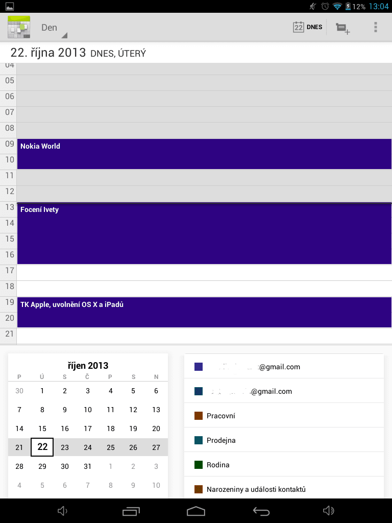 Předně, GPS v TM-7854 nehledejte, tablet čip neobsahuje. Co se týká kalendáře, je připraven standardní Google kalendář ve svém základním provedení. Měsíční náhled tak dokáže zobrazovat různé typy událostí různě barevně odlišené, tak jako týdenní používá klasickou časovou osu, kdy najednou lze vidět rozmezí 14-ti hodin.