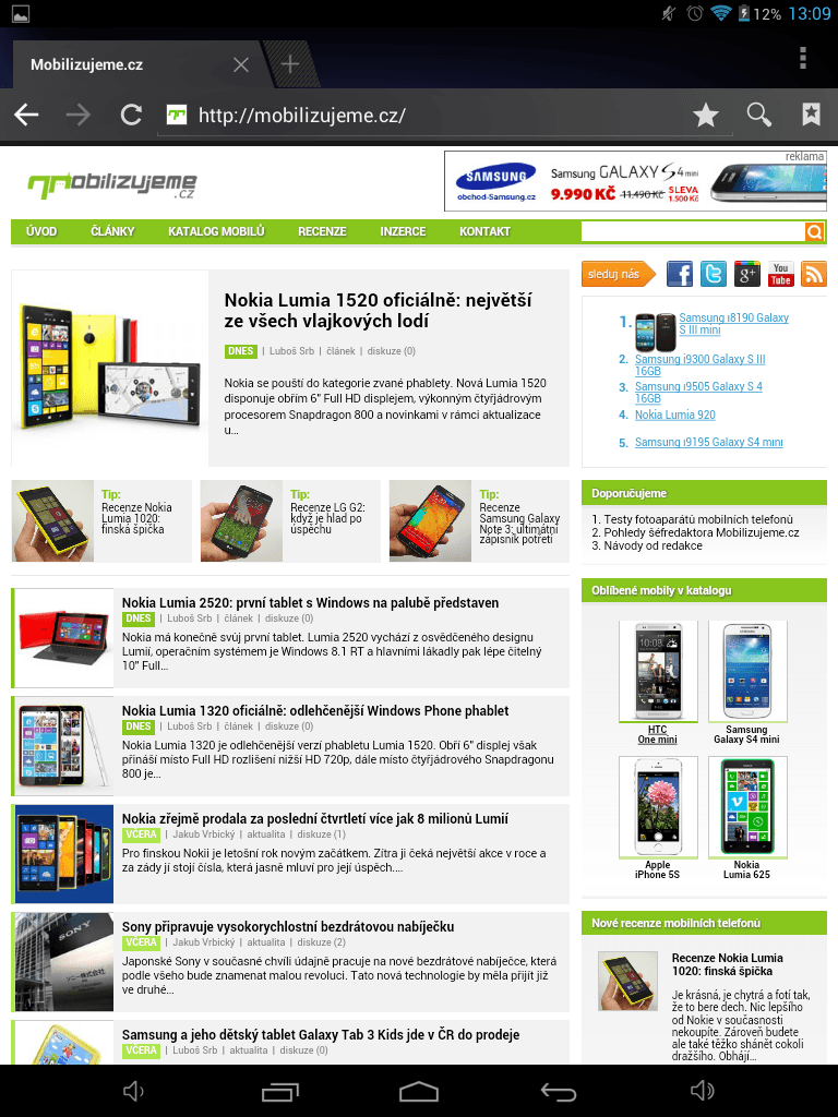 Webový prohlížeč je zastoupen klasickým WebKitem, který najdeme v každém Androidu. Práce s ním je bezproblémová, stránky se načítají plynule, nepozoroval jsem větší problémny. Při doinstalování Chrome prohlížeče se taktéž uživatel nesetká s žádným problémem, navíc ale samozřejmě získá kompletní synchronizaci napříč svými počítači a tablety, pokud na nich taktéž používá Chrome.