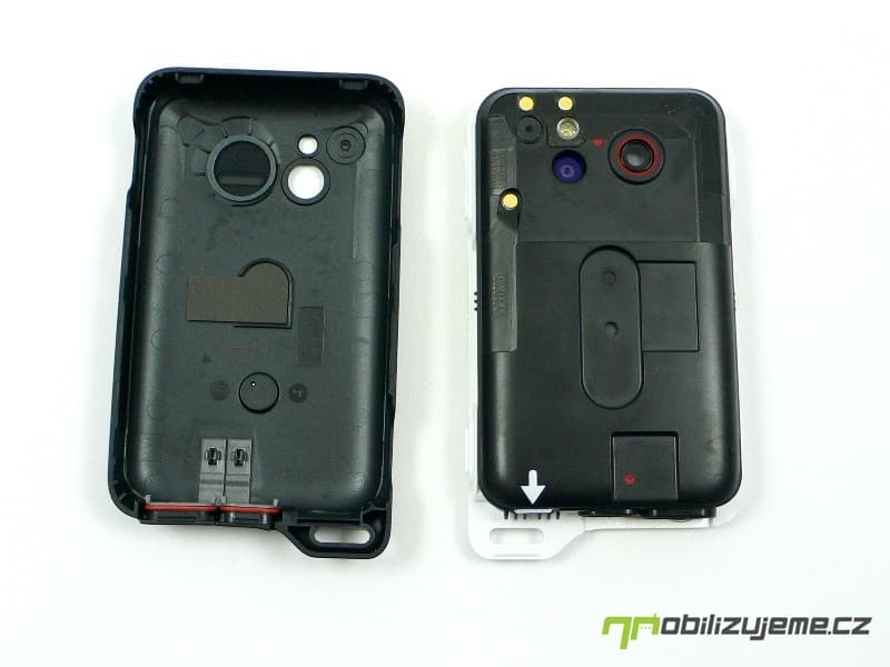 Sony Ericsson se na možnost proniknutí vlhkosti do telefonu Xperia Active dobře připravil. Po sejmutí zadního krytu už to vypadá, že uživatel nebude moci vyjmout baterii, jelikož se k ní nedostane, opak je ale pravdou! Pod zadním krytem je další plastová vložka s gumovými vložkami na okrajích, a ta je položena do konstrukce. Dle šipky ji snadno sejmete také. Ta zaručí, že voda opravdu do přístroje nevnikne. Baterie tedy vyjmout lze. Jedná se o Li-Pol baterii s kapacitou 1200 mAh.