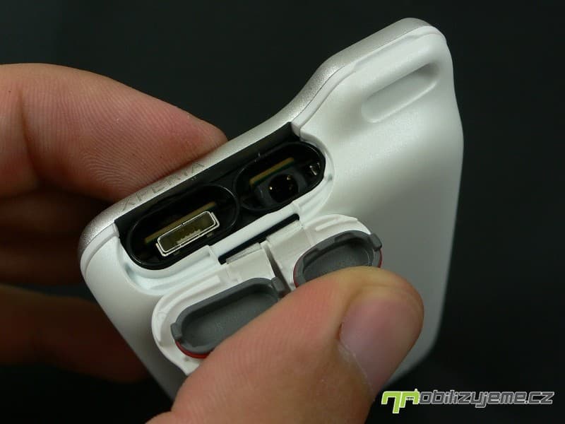 Xperia Active zaujme na první pohled jedinečným zakončením spodního okraje, kde je otvor pro poutko či lépe pásek, který je součástí balení. I když se jedná o odolný smartphone, výrobce přibalil i výměnný zadní kryt, v našem případě jsme měnili černý za perleťově bílý, který telefonu více sluší. Konektory na konstrukci jsou zakryté gumovými špuntíky, a tak by nemělo docházet k pronikání vlhkosti a vody.