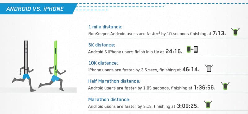 Lidé, kteří stojí za populární a rozšířenou mobilní aplikací RunKeeper, udělali zajímavé srovnání. Na základě dat uživatelů zjistili, kdo běhá rychleji (Android vs iPhone). Tedy alespoň z uživatelů této aplikace (musíme brát v úvahu, že u výsledků může hrát roli popularita jedné aplikace před druhou a u obou platforem – Android a iOS, resp. také ochota sdílet své běžecké výsledky).