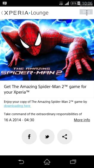 Sony si nachystalo speciální akci pro majitele svých zařízení, v ní máte možnost získat novinku od Gameloftu zdarma! Jediné, co potřebujete k získání hry The Amazing Spider-Man 2, je bezplatná aplikace Xperia Lounge, ve které následovně naleznete nabídku ke stažení samotné hry.