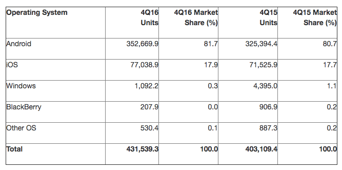 V posledním čtvrtletí loňského roku bylo prodáno celkem 434 milionů chytrých telefonů – z toho 352 milionů Android zařízení (81,7 %), 77 milionů iOS zařízení (17,9 %) a pouhá 0,3 % zařízení s Windows Phone a již mrtvém BlackBerry OS.