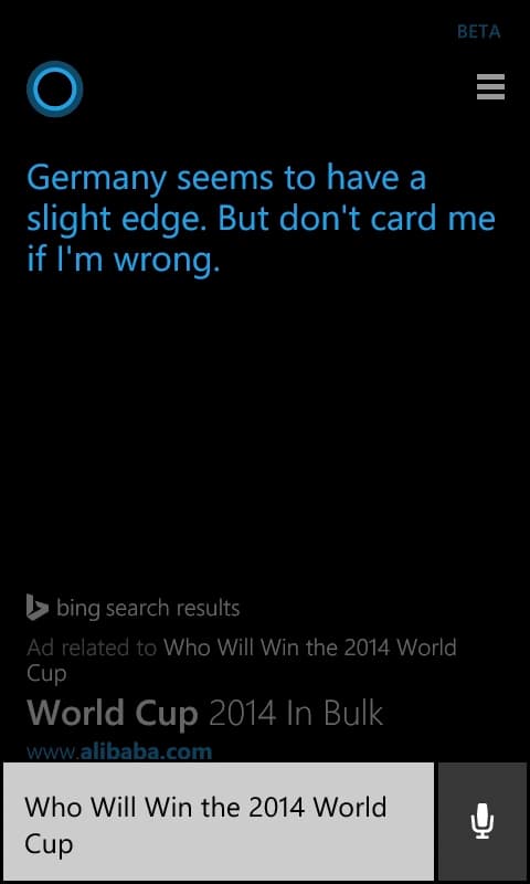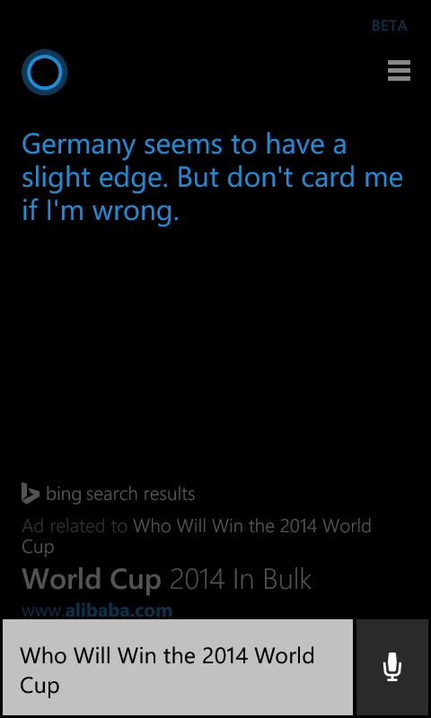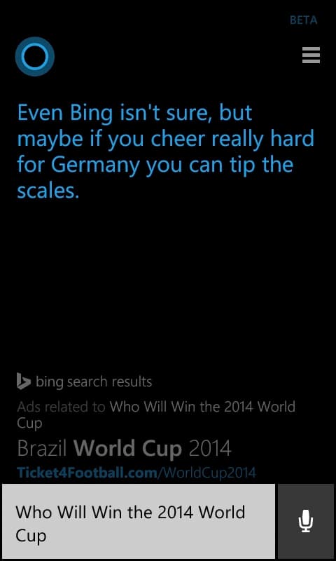 Hlasová asistentka z Windows Phone 8.1 už má jasno, kdo zvítězí ve finále fotbalového MS v Brazílii. Jako vítěze vidí Německo. Naopak Argentina prý skončí jako poražený tým.