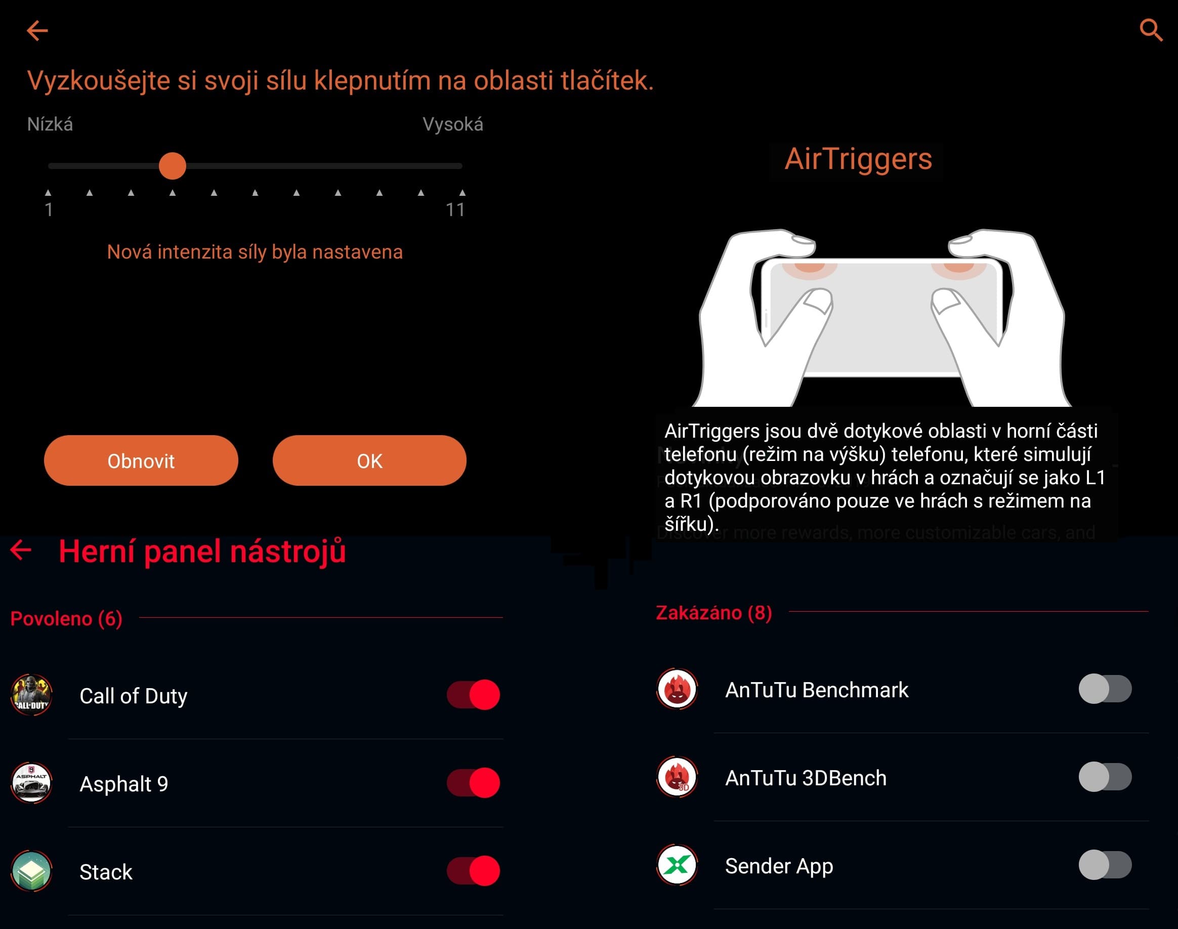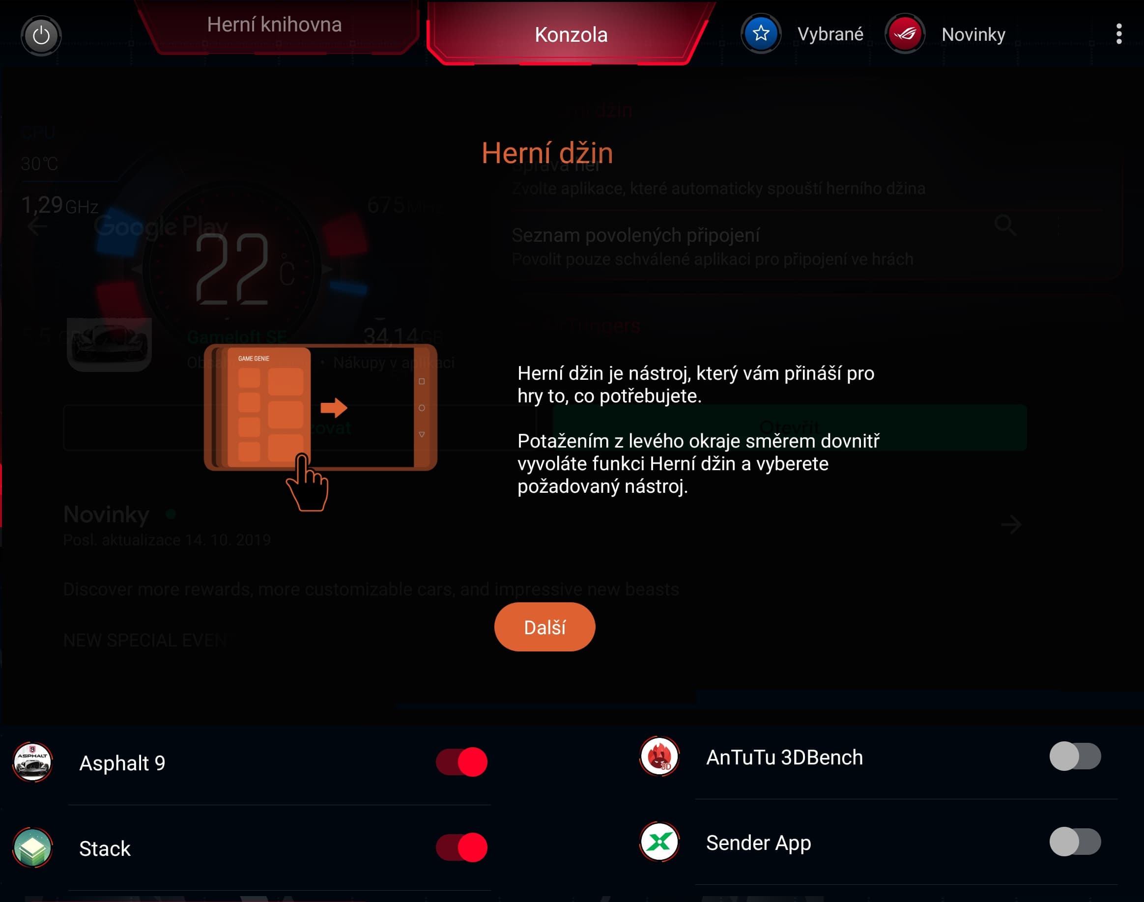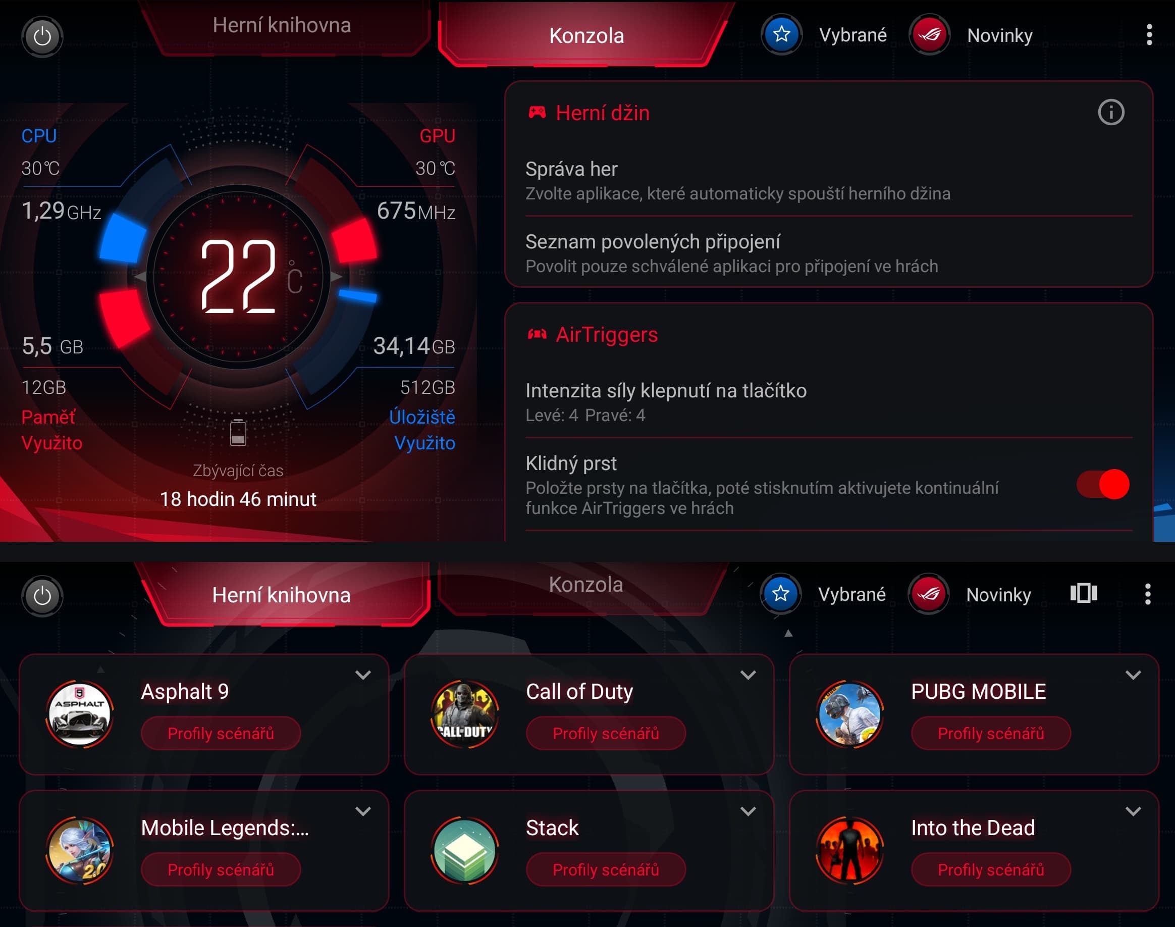 Armoury Crate je softwarovým srdcem telefonu a má na herní prožitek podstatný vliv. V samotné aplikaci si vytváříte, editujete a ukládáte profily jednotlivých her, ať už jde o celkový výkon, FPS, přetaktování procesoru a grafického čipu nebo intenzitu senzorových tlačítek. V první podsekci „Herní knihovna“ máte seznam her, ke kterým přidělujete vámi nastavené profily. Ve druhé, která se jmenuje „Konzola“ pak získáváte ucelený přehled o systému, tj. teplotě čipsetu a baterie, vytížení RAM, volném vnitřním úložišti a výdrži baterie.