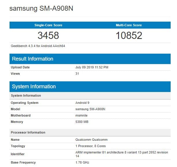 Telefon, který byl testován jako Samsung SM-A908N, běží na Androidu 9 Pie a má 6 GB RAM. Základní deska označená jako msmnile je stejná jako u jiných zařízení běžících právě na Snapdragonu 855. SM-A908N získal skóre 3 458 bodů v jednom jádru a 10 852 v multijádrovém testu. Skóre jsou to taktéž podobná jiným zařízením poháněným stejným čipsetem.