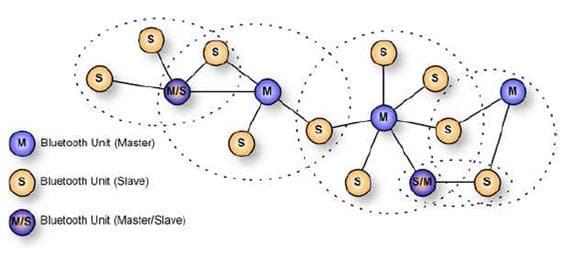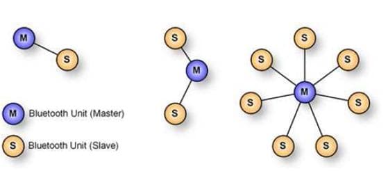 Technologie Bluetooth podporuje dva typy komunikace – dvoubodovou a vícebodovou. V případě dvoubodového přenosu se jedná o klasickou point to point komunikaci, tedy přímé spojení dvou zařízení. V případě vícebodové, takzvané multi point komunikace, má jedno zařízení status master. Zařízení s tímto označením tak slouží jako jakýsi přístupový bod, na který lze následně připojit až 7 jiných zařízení, které mají statut slave. Takto vytvořené seskupení se nazývá piconet. Tyto pikosítě je možné dále sdružovat do takzvaných scatternet – rozprostřených sítí. V jedné rozprostřené síti může být maximálně 10 pikosítí. Každé Bluetooth zařízení by mělo mít svůj název, tzv. Bluetooth Device Adrress, což je jakýsi ekvivalent MAC adresy u internetových protokolů.