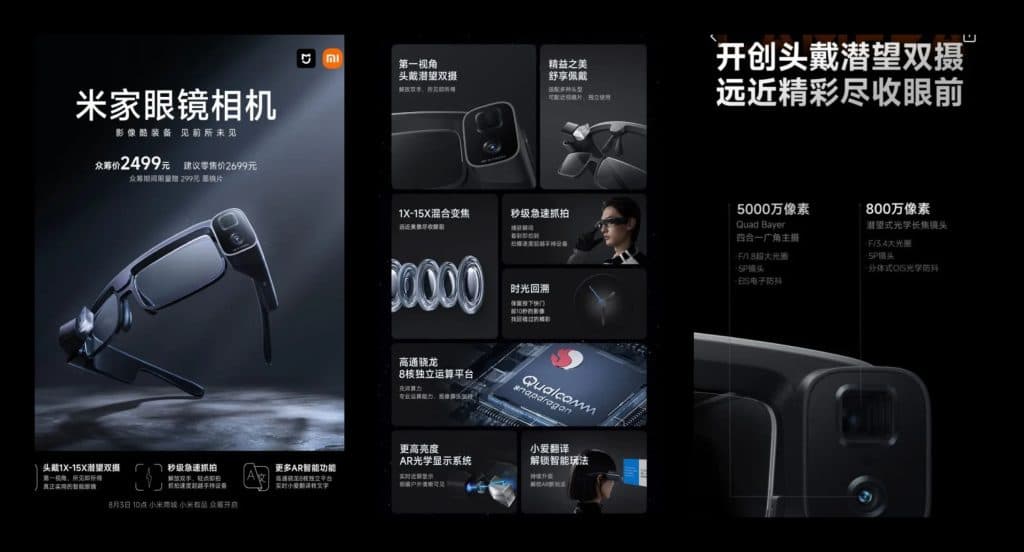 Xiaomi si u svých nových brýlích dalo hodně záležet hlavně na fotosoustavě. Duální fotoaparát s rozlišením 50 + 8 Mpx obsahuje primární snímač, jemuž dělá společnost periskopický objektiv. Fotoaparát je opticky stabilizovaný, nabízí až 5× optický a 15× digitální zoom a zvládne až 100 minut nepřetržitého záznamu. V tomto směru si Xiaomi s novinkou opravu vyhrálo.