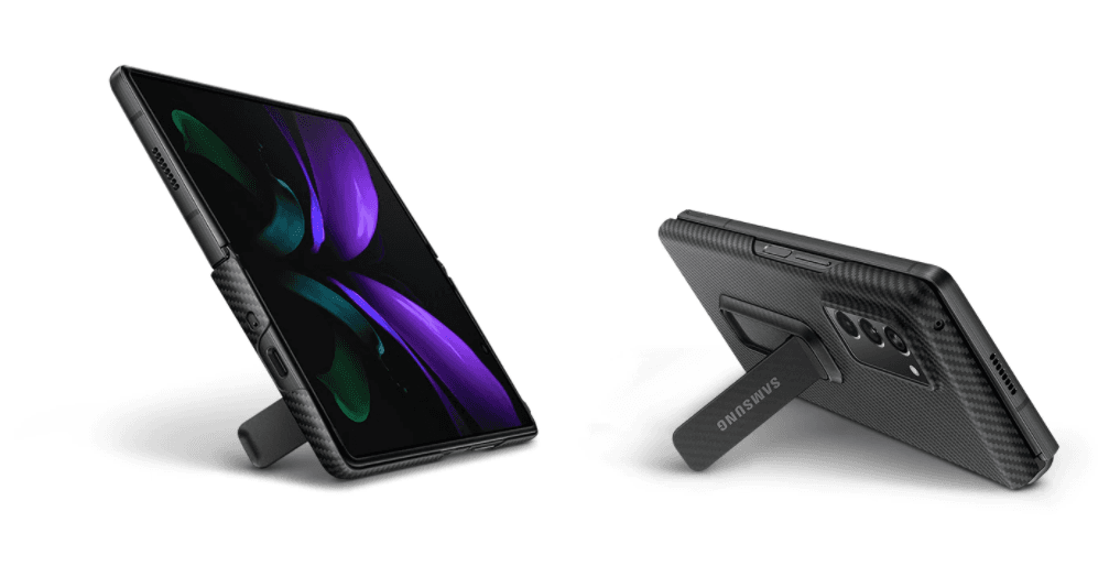 Potvrzeno bylo stojící pouzdro nazvané Aramid, v černém karbonovém provedení, které má na zadní straně odnímatelnou nožku k postavení. Ta se hodí například k pohodlnému sledování filmů nebo k videohovorům a lze ji využít jak v otevřeném, tak i v zavřeném stavu.