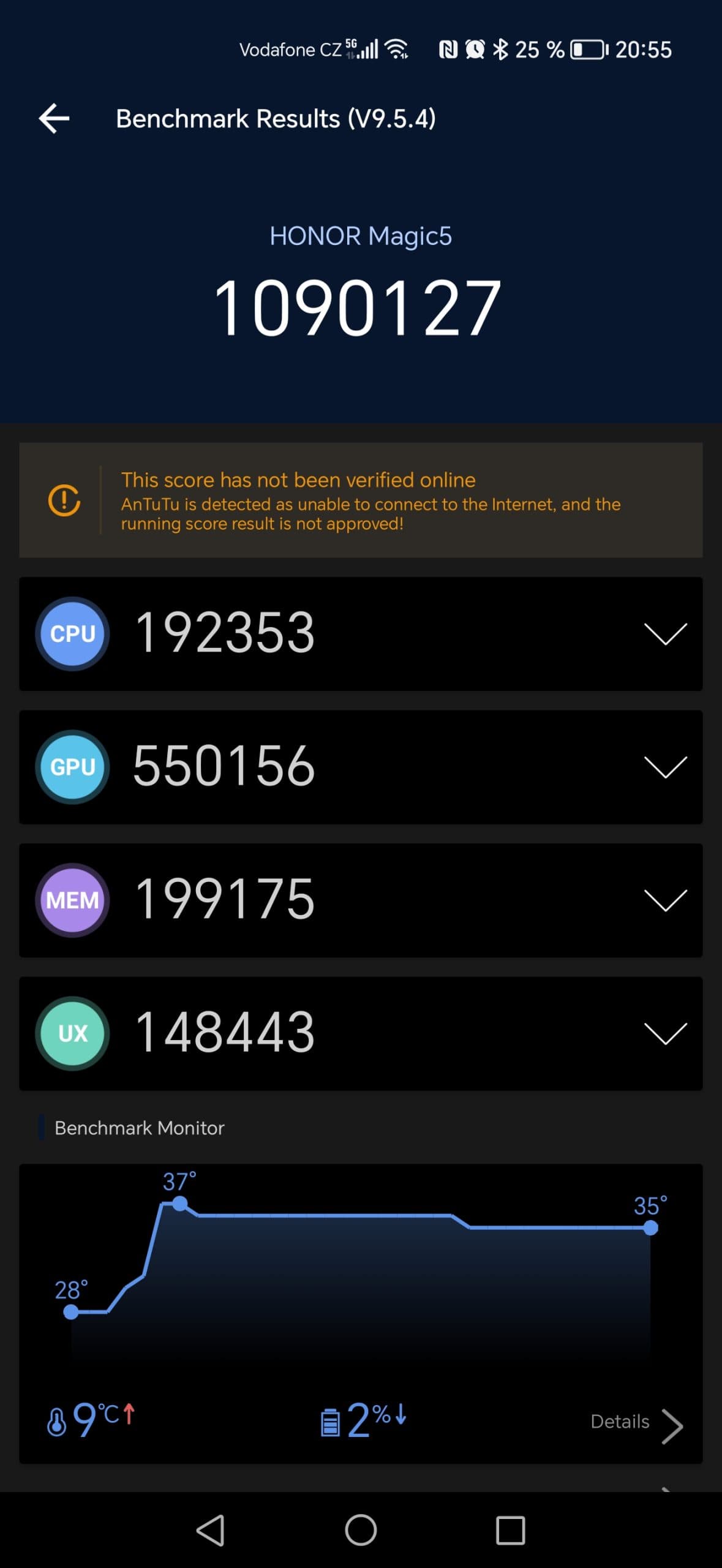 Vysoký výkon potvrzují také syntetické benchmarky v čele s populárním AnTuTu, ve kterém tato novinka dosáhla skvělého výsledku takřka 1,1 milionu bodů. Jedná se tedy o jeden z nejvýkonnějších telefonů dneška a vcelku solidní je také produkce tepla. Chlazení se docela povedlo, zvládá udržet telefon v rámci rozumných teplot i při dlouhodobějším hraní a toho, že by se telefon vlivem extrémních teplot nedal udržet v ruce, se jen tak nedočkáte. Stabilita v zátěžovém testu 3DMark byla sice pouze průměrná (45 %), ale pocitově se žádné extrémní topení nekonalo.
