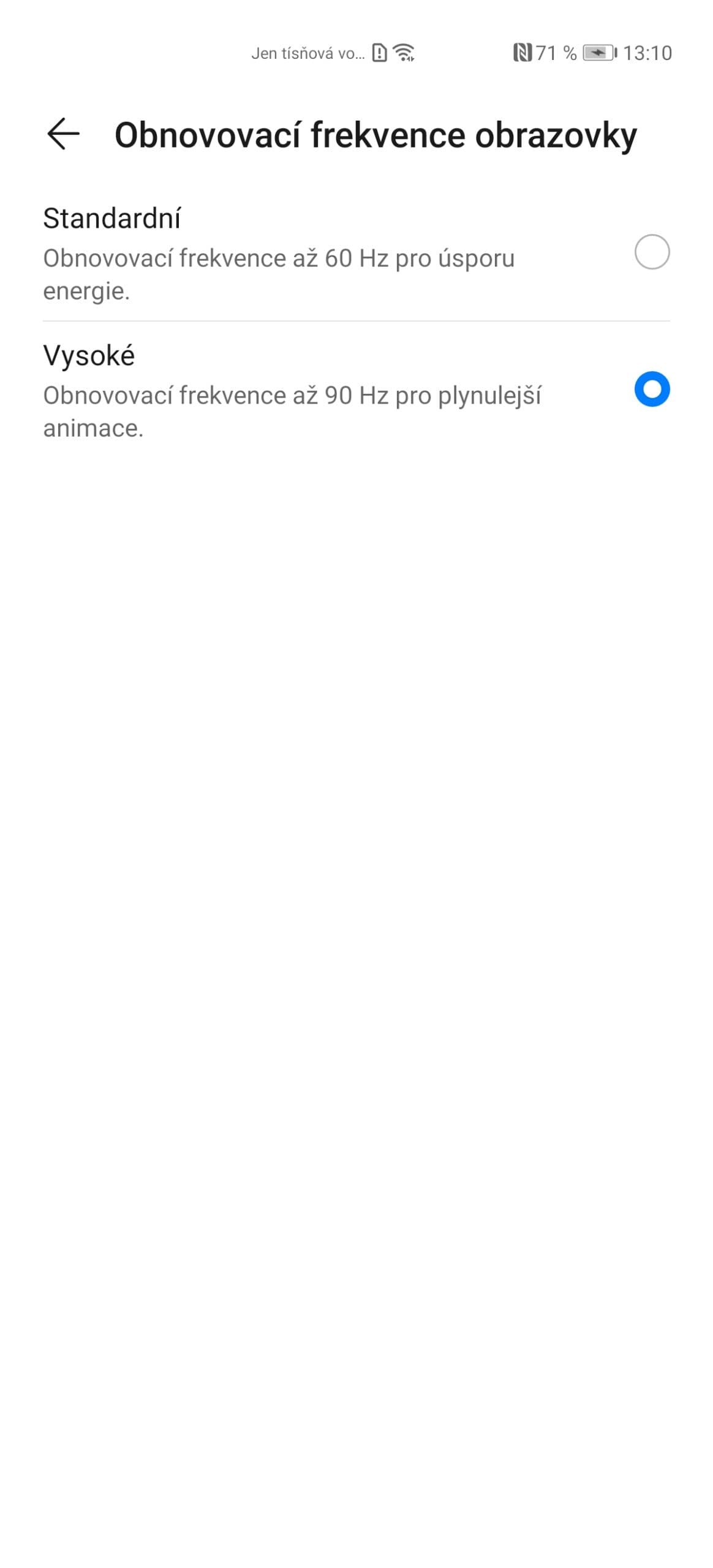 Jinak je velikost výborná (6,58 palců – takže nic pro tintítka), barvy dostatečně živé a Huawei dokonce přispěchal s maličkým překvapením v podobě 90Hz obnovovací frekvence. Ta bohužel nejde nijak korigovat a buď ji máte zapnutou nebo naopak. Je určitě správně, že Huawei tuto technologii zvolil, protože je to trend a oproti konkurenci by čínská firma jen víc a víc ztrácela. Takhle si může tuto populární fičuru odškrtnout a věnovat se důležitějším věcem. Anebo také ne.
