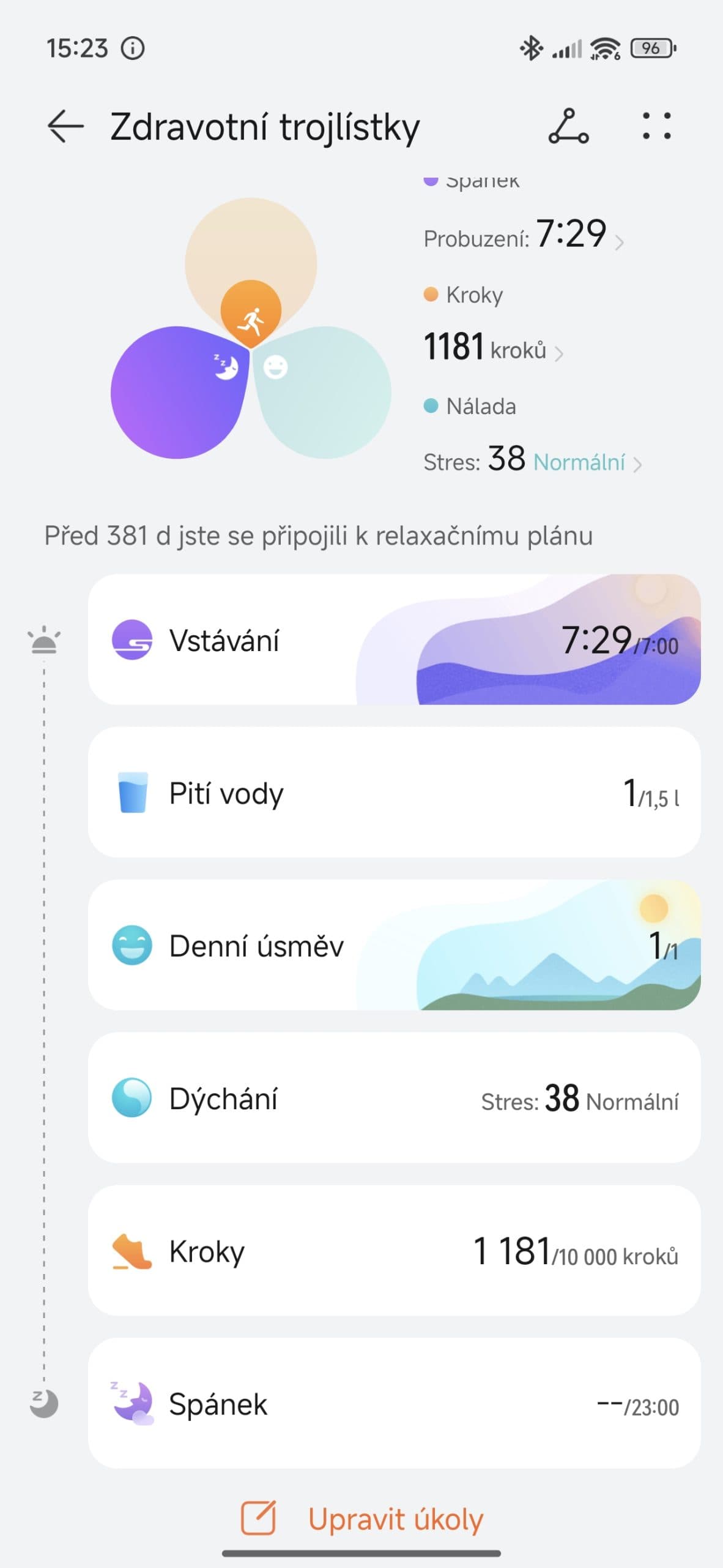 Dále se mohou pochlubit skvěle propracovaným měřením spánku, změří teplotu vaší pokožky a poradí vám s emoční pohodou. Hauwei se navíc snaží motivovat ke zdravému životnímu stylu. Například pomocí trojlístků, které můžete vždy vyplnit. Je potřeba ale zadávat údaje o pití vody, dodržet spánkový režim nebo splnit denní aktivity.
