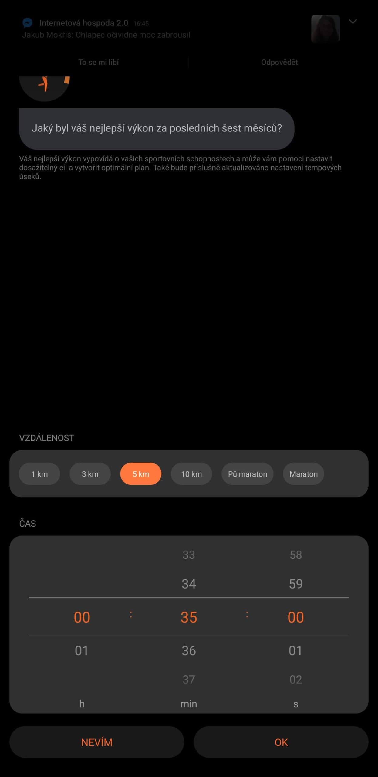 Prostřednictvím chatbota sice můžete zadat své tělesné míry a výkony, aby vám aplikace sestavila tréninkový plán, ale o jeho odbornosti by se dalo s úspěchem pochybovat. Oznámil jsem třeba, že za měsíc naběhám víc než 300 kilometrů a jeden kilák zaběhnu za 2 minuty 11 sekund (méně nastavit nešlo) a chci makat maximálních 6 dnů v týdnu. Navržený plán byl, že dva dny v týdnu si dám na 20 minut lehký běh a čtyřikrát půjdu na půl hodinky střídat chůzi s během. A když jsem se šel proběhnout jen tak, do plánu se trénink nezapočítal, i když měl stejné složení, jako trénink podle plánu.