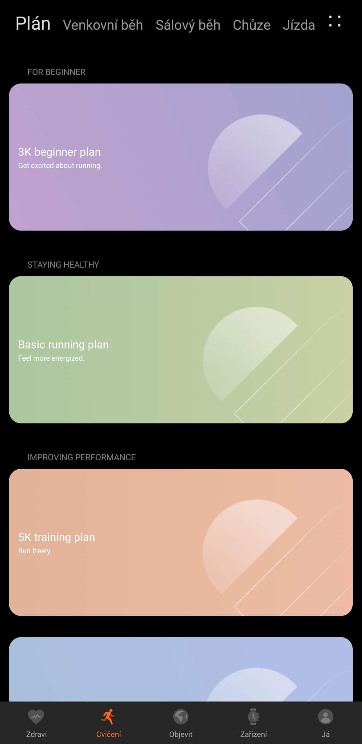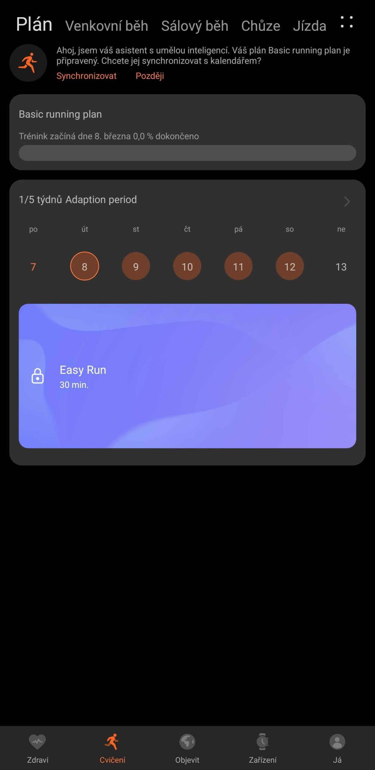 Zatímco všechny podporované sporty (a že jich je, včetně bizáru, jako je rybaření nebo „badmintonový míček“) jsou popisované metrikami energie, dráha, čas, tepová frekvence, běhání se dostalo vyšší pozornosti. Schválně neříkám výjimečné, běh měl u Huaweie vždycky protekci. Tou položkou navíc jsou běžecké plány, které by vám měly pomoci k dlouhodobému zvýšení výkonnosti. Jenže…