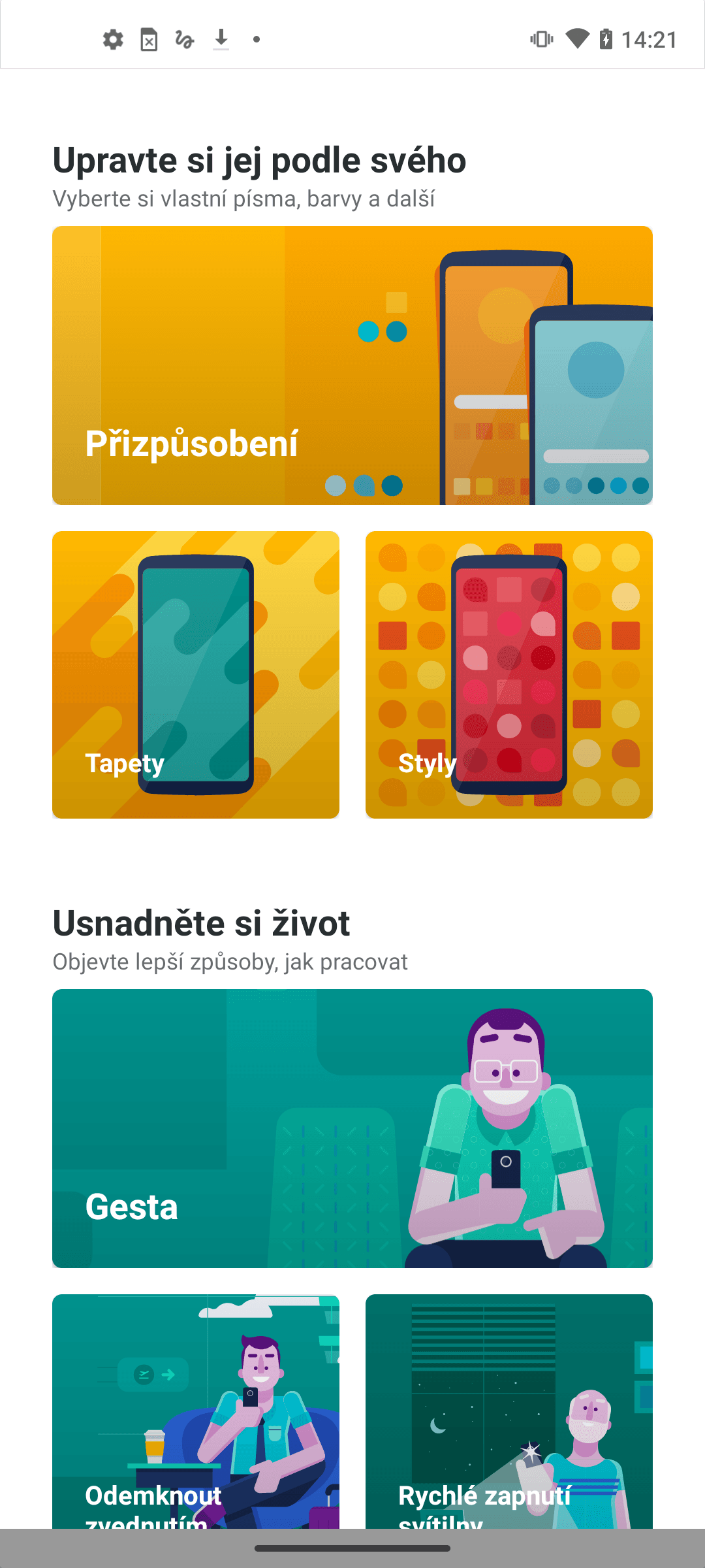 Téměř čistý operační systém uvnitř Moto G9 Plus si zamilujete. A to přesto, že čistý vlastně jen vypadá. I samotný výrobce se chlubí tím, že přizpůsobit jeho vzhled můžete velmi detailně – od tvaru ikonek, přes font textových nabídek, až po implicitní barvu zvýrazněných voleb. Motorola také do systému přidala vyskakovací menu přístupné po dvojím poklepání na zamykací tlačítko.