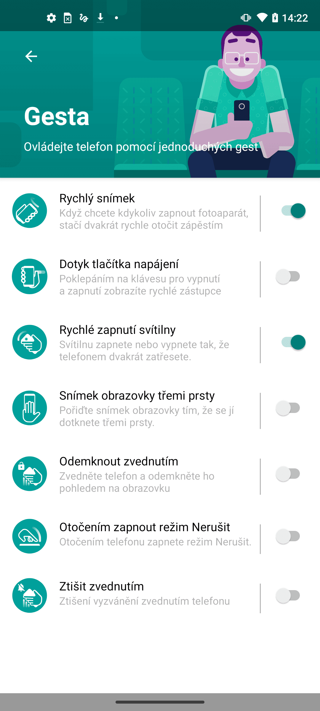 Asi se shodneme, že by bylo lépe nevymýšlet něco již vymyšleného. Drobnou útěchou budiž fakt, že obě gesta fungují relativně spolehlivě a příslušnou funkci se vám většinou vyvolat podaří. A kdyby ne, foťák lze zapnout i klasicky dvojím stisknutím vypínacího tlačítka. Tuto volbu ovšem musíte aktivovat až v hloubi menu.