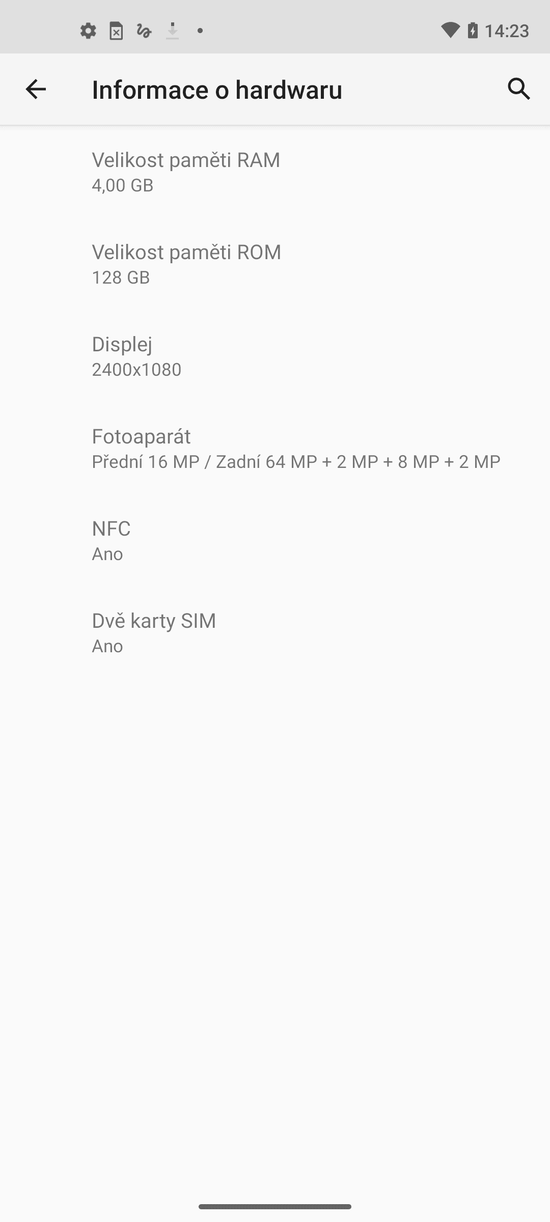 | Fotoaparát | čtyři (64 Mpx hlavní + 8 Mpx širokoúhlý 118° + 2 Mpx makro + 2 Mpx hloubkový), clona f/1.8 + f/2.2 + f/2.2 + f/2.2, EIS, laserové ostření, duální LED blesk; přední 16 Mpx, clona f/2.0 |