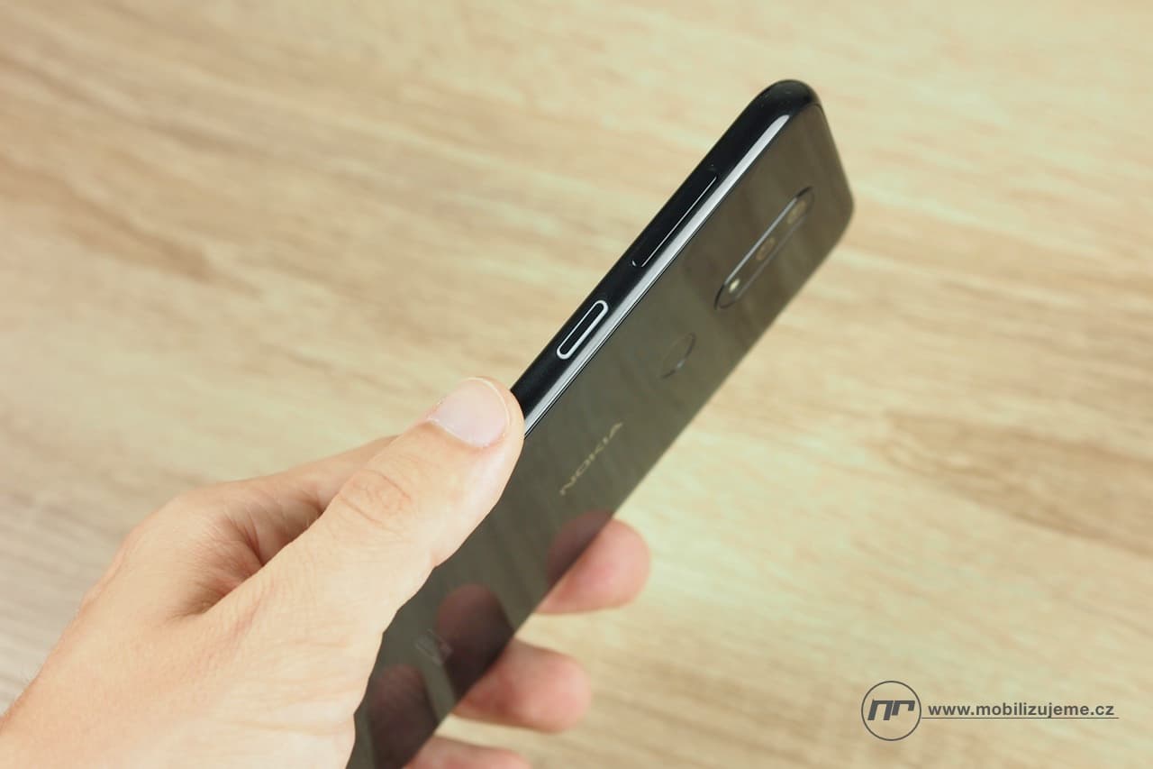 Nokia už na první pohled u telefonu vsadila na naprosto hladký design, neobyčejně zaoblený tvar a kromě několika málo prvků čistě černou barvu. Telefon se drží v ruce příjemně, jen při zapření malíčku o hranu trochu škrábe dolní plastový rámeček. Díky přiměřeným rámečkům kolem displeje a použití zaobleného skla se design pozvolna roztéká ke stranám. Dokud displej nerozsvítíte, ani si nevšimnete výřezu ve tvaru kapky nahoře. Zvláštní pocit mám jen ze zadní strany, která sice je skleněná, ale na omak působí jaksi igelitově. Pořád jsem měl pocit, že je na ní nějaká vrstva navíc. Osobně si myslím, že Nokia ušetřila a použila levnější druh skla, čemuž napovídá i extrémní sklon k upatlání otisky prstů. Na konci testování se také projevilo nošení bez obalu několika menšími škrábanci, tak pozor na to.