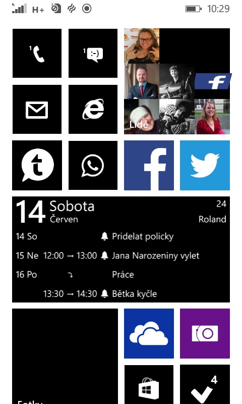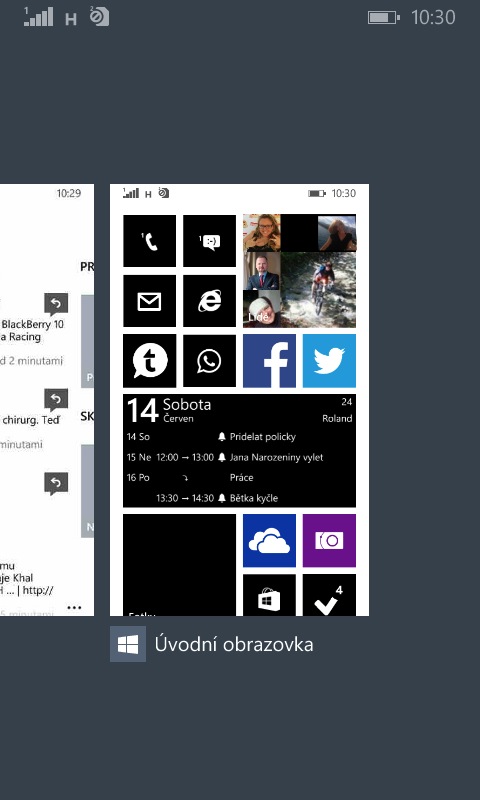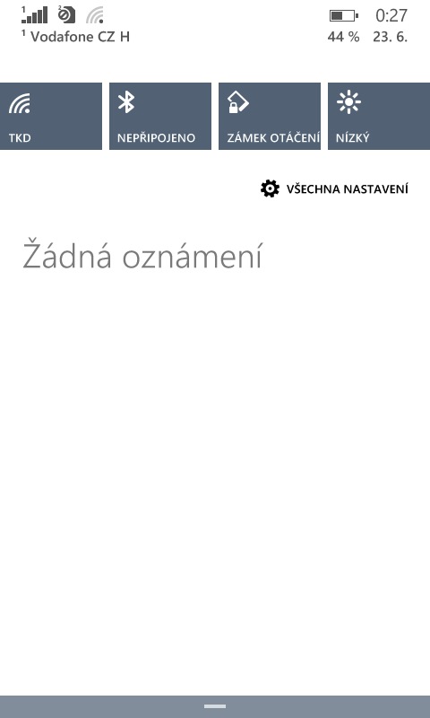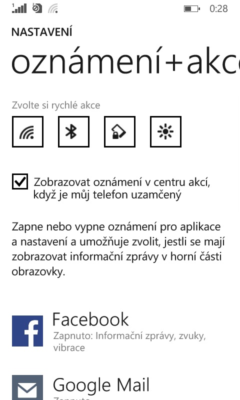 To je jedna z novinek nového operačního systému, byť ne zdaleka ta nejviditelnější. Uživatelé přecházející z Androidu si budou určitě pochvalovat stahovací notifikační lištu. Osobně na ní však příliš pozitiv nevidím. Přepínače bezdrátových modulů příliš nekorespondují se zbytkem designu prostředí a příliš domyšlené nejsou ani notifikace samotné. Každá zpráva má například svou vlastní notifikaci, takže pokud přijdete k telefonu po delší době, budete mít problém se v nich zorientovat. Naštěstí lze zvolit, jaké aplikace mají do centra přístup. Teoreticky se bez něj tedy dá obejít a nechat notifikace na jednoduchém a efektním zobrazení číslice na LiveTiles.