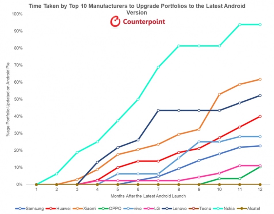 Důkazem toho je i čerstvě zveřejněná studie analytické společnosti CounterPoint. Ihned na začátku je nutné zdůraznit, že jde o období mezi třetím kvartálem loňského roku a druhým kvartálem toho letošního. Nejde tedy o víceleté srovnání, které by mělo mnohem lepší vypovídací hodnotu, přesto pro ilustraci i tak poslouží dobře. Z uvedených výsledků tedy vyplývá, že zde naprosto dominuje společnost HMD Global se svými mobily Nokia, kde 96 % zařízení vydaných od třetího čtvrtletí minulého roku má nainstalováno Android 9 Pie. Zbylá 4 % běží na lehce obstarožním Androidu 8.1 Oreo.