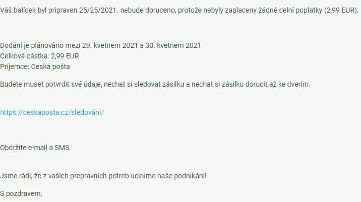 Za žádných okolnosti na nic neklikejte, na zprávu; ať už emailem nebo formou SMS nereagujte! Jde jen o způsob, jak z váš a vašich účtů vylákat peníze. Největší průšvih je v tom, že útočníci sází na to, že nějakou skutečnou zásilku v přepravě máte. V tomto směru buďte velmi obezřetní a nenechte se napálit. Následky mohou být krajně nepříjemné.