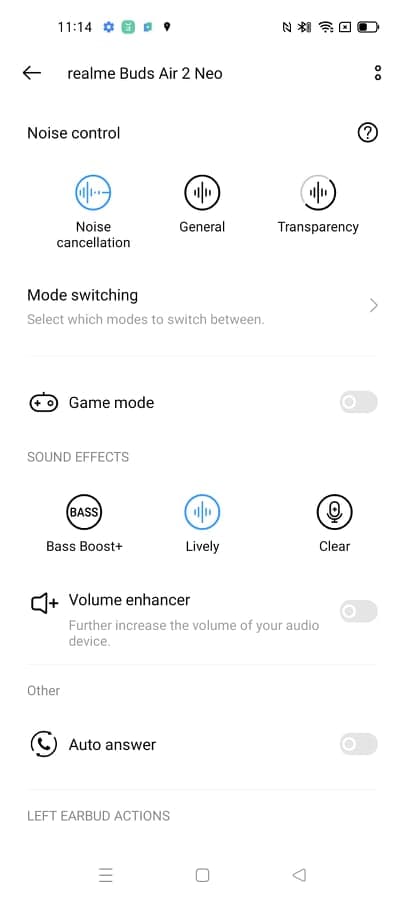 Realme Buds Air 2 Neo přichází s příslibem kvalitního potlačení okolních hluků a také s režimem propustnosti. Bohužel, ani jedna funkce si nezaslouží pochvalu. ANC, tedy active noise cancelling (aktivní clona hluků), cloní absolutní minimum okolních hluků, i když se výrobce chvástá až 25 dB zvuku, který dokáže odclonit. Nu nevím.