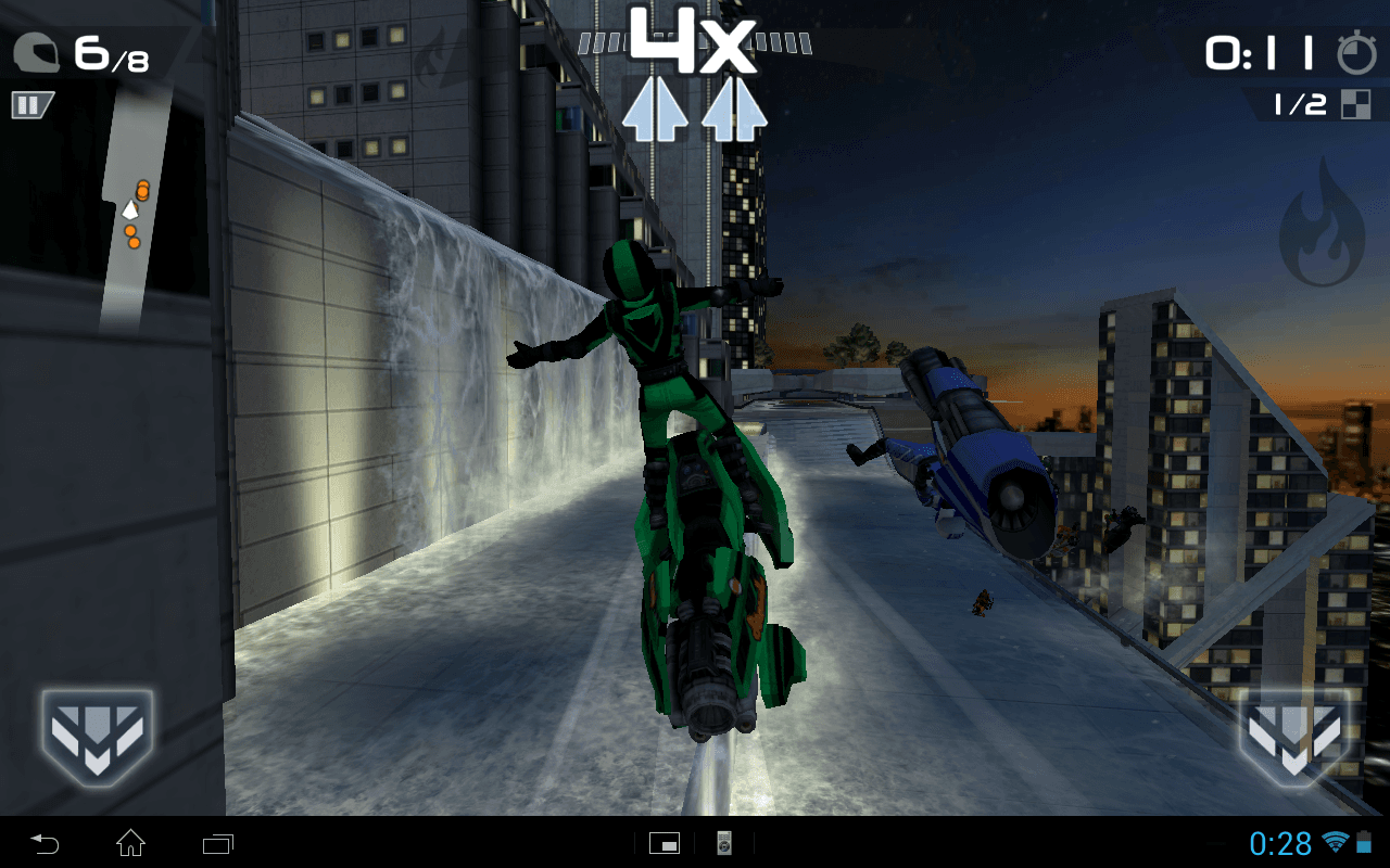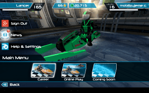 Skútrů je ve hře 9 druhů a každý jde vylepšit ve čtyřech položkách o několika stupních. Navíc lze na skútr aplikovat paletu barev, tak jako na kombinézu jezdce. K dispozici máte 8 šampionátů, ve kterých se míchají různé tratě, ať zimní jeskyně, noční město, stadión či slunečná riviéra. Navíc hra obsahuje real-time multiplayer, kde závodíte proti až 3 živým hráčům a nutno podotknout, že zábava jde nahoru. Pouze škoda, že hra nevybírá hráče na stejné úrovni a se stejnou úrovní skútru. Není tedy problém narazit na někoho, kdo má lepší mašinu jak vy a hned po startu vám okamžitě zmizí z očí.