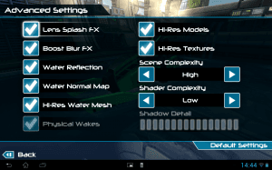 Co už není standardem, je možnost přizpůsobit si grafickou podobu hry. Riptide GP2 sice vše nastaví dle výkonu vašeho mobilního zařízení, přesto si můžete sami volit rozlišení, kvalitu textur, modelů, kvalitu vody, rozmazání obrazu při vysoké rychlosti apod. Pokud tedy máte i přes automatické nastavení pocit, že by hra mohla běžet rychleji, Riptide GP2 vám k tomu dává nástroje. Chválím.