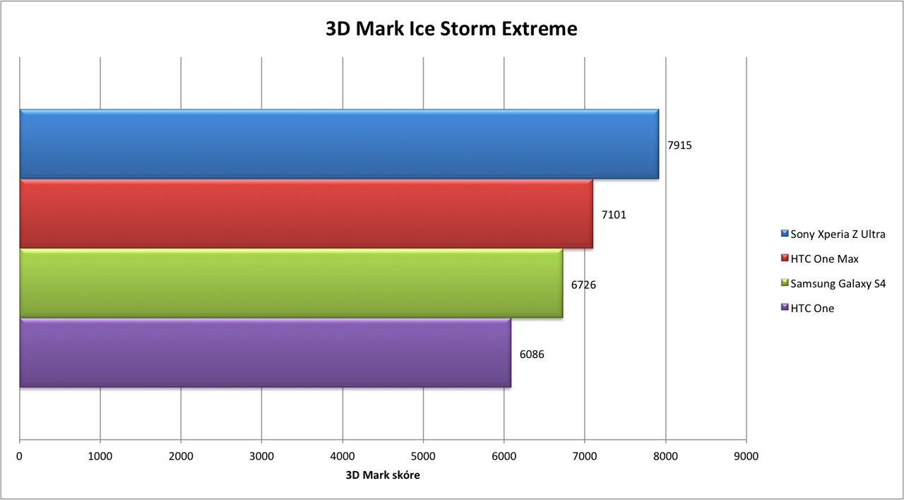 Posledním, třetím testem, je 3D Mark coby letitá klasika z PC scény, která prověřuje grafický výkon zařízení. Testy provádíme ve dvou možnostech testu. Ice Storm renderuje veškerou grafiku v rozlišení 1280×720, používá normální kvalitu textur a normální post-processing. Extreme verze renderuje grafiku v rozlišení 1920×1080, textury používá ve vysokém rozlišení a taktéž je zde použité vysoké nastavení post-processingu. Unlimited verze vynechává dopad rozlišení displeje, vertikální synchronizace a dalších aspektů pro vyobrazení výsledného čísla, bez ovlivnění vlivů mimo CPU, GPU a RAM. Jedná se tedy o výsledek vyjádřený na úrovni hardwaru, bez okolních vlivů. Vzhledem k vyššímu výkonu umožnil 3D Mark jen náročnější verzi Extreme a Unlimited.