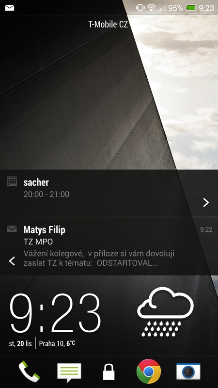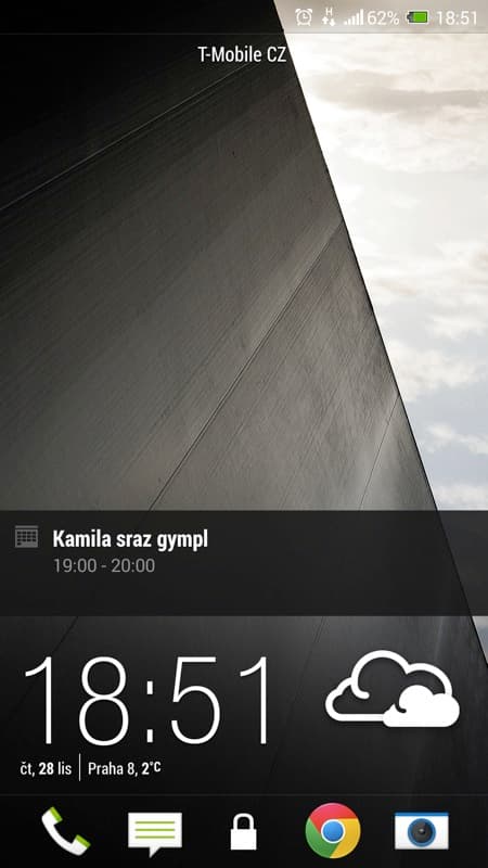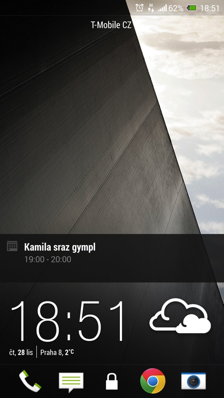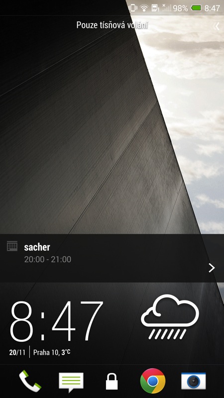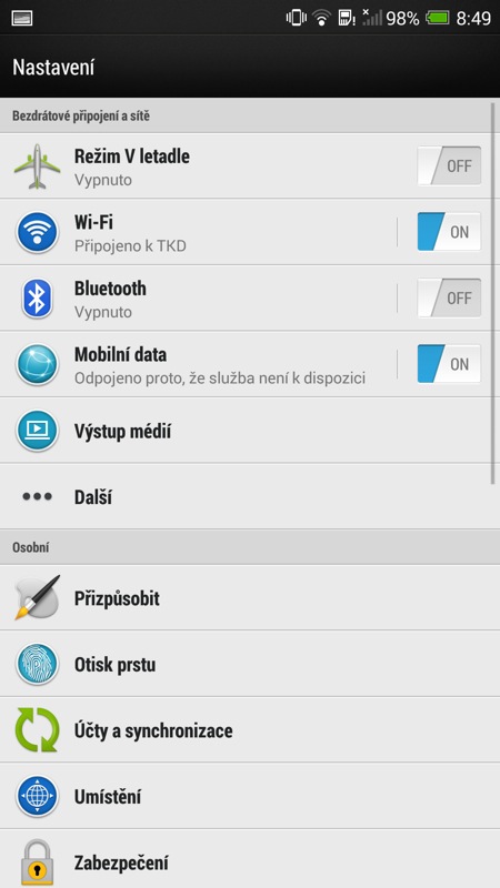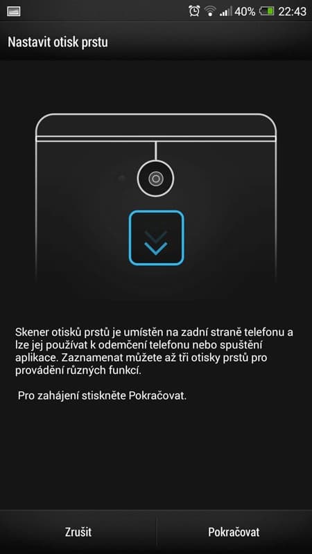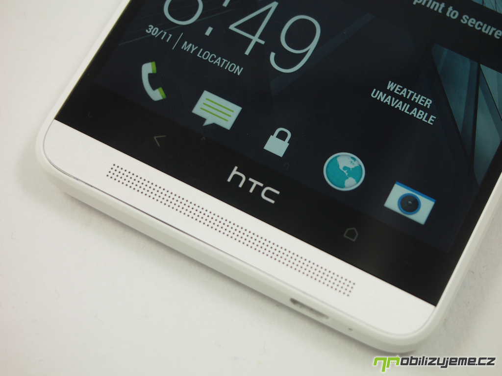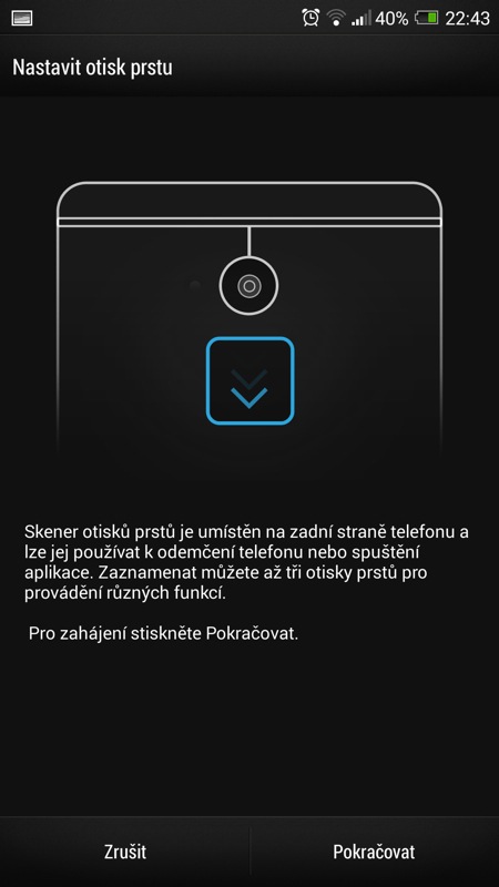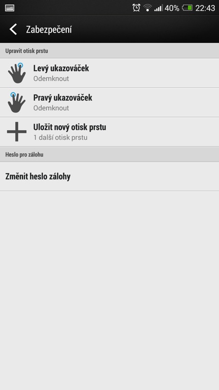 V současné „době dotykové“ se HTC snaží zaujmout také relativně novým prvkem v zabepečení telefonu. Přístroj můžete odemknout otiskem prstu. Stačí nechat telefon zapamatovat tři vaše otisky a poté, co vás přistroj vyzve, jedním z prstů přejet po čtečce umístěné pod čočkou fotoaparátu. Nebudu vás napínat: tuto funkcionalitu jsem po hodině testování vypnul. Funguje sice relativně spolehlivě, přesto občas váš prst nerozezná a opakování celého procesu je otravné. Možná kdyby v HTC čtečku místili na stejné místo jako u iPhonu 5S, dávalo by to celé větší smysl. Pod čočku ale většinou při používání telefonu nesahám a musel jsem si tak zvykat na úplně nový, a tak trochu přes koleno naroubovaný způsob ovládání.