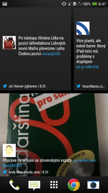Anebo: Proč potřebuji jiný postup na změnu tapety, jiný na přidání widgetu a jiný na připíchnutí zástupce aplikace na plochu? Ve výčtu těchto drobných neduhů bychom mohli pokračovat ještě dlouho. Za zcela zásadní nedostatek však považuji fakt, že v HTC evidentně neumějí naložit s ohromnou úhlopříčkou telefonu. Je sice fajn, že se vedle sebe na pracovní plochu vejde pět ikon vedle sebe. Proč se ale v seznamu aplikací rázem vedle sebe vejdou jen čtyři, mi hlava nebere. I dock by určitě pojal šest nejpoužívanějších funkcí, jako je tomu například v tabletovém prostředí Androidu.