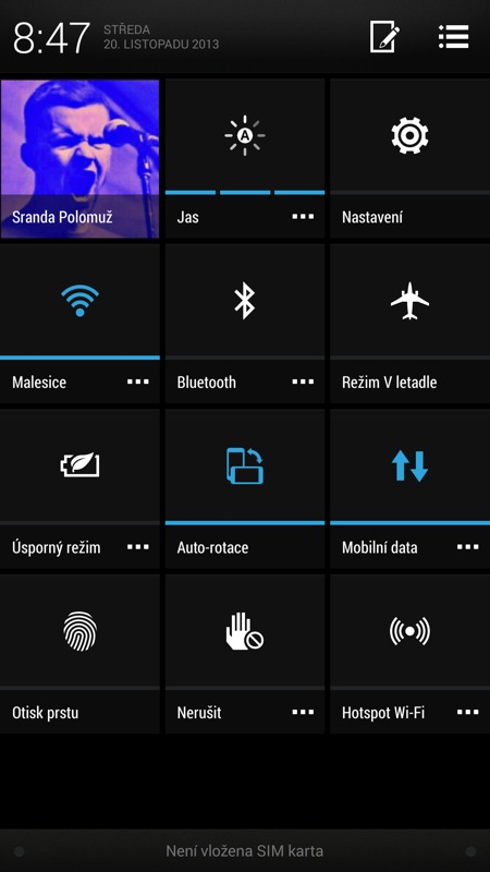 Uživatelské prostředí HTC Sense 5.5 s sebou nese klady a zápory najednou. Nejprve si projděme kladné stránky. Ač nejsem zrovna předseda fanklubu operačního systému Android, grafickou nadstavbu Sense mám rád. Jeho nejnovější verze, která v HTC One Max překrývá Android ve verzi 4.3, přináší zejména pohledné systémové ikonky, příjemnou možnost personalizovat přepínače v horní výsuvné liště nástrojů, nebo i šikovné pomůcky v nastavení. Ty reprezentuje například možnost přenést data z jiného telefonu, který nemusí nutně mít operační systém Android. Mám rád čistý design Sense spojený s extrémně rychlou a plynulou odezvou (aby také ne, při velkorysých hardwarových parametrech). Miluji povedený sleep mode, zejména v jeho automatické variantě, kdy se telefon v předem daném časovém intervalu uspí po patnácti minutách, pokud ho necháte na pokoji. Určitě se najdou i lidé, kteří přijdou na chuť volitelné obrazovce BlinkFeed, která dovede na jednom místě zobrazovat články z nejrůznějších informačních zdrojů, sociálních sítí, nebo i kalendáře a aplikace počasí.