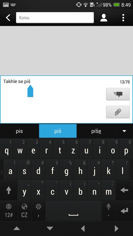 Z vlastní zkušenosti můžu dosvědčit, že s HTC Max One budete psát SMS zprávy daleko raději než telefonovat. Právě během psaní se totiž naplno projeví největší výhoda obřího telefonu – obří klávesnice. Kdykoli a v jakémkoli stavu jsem dokázal napsat na HTC klávesnici zprávu bez překlepu, aniž bych se musel na klávesy nějak zvlášť soustředit. Pokud byste ale přeci jen nechtěli do klávesnice ťukat, směle zapněte psaní pohybem prstu – funguje stejně dobře i díky kvalitnímu vestavěnému slovníku. Bohužel, osobně pro mě kazí dojem z jinak povedené SMS aplikace nešikovné provedení doručenky zpráv. Ta se ohlásí stejným zvukem, jako SMS zpráva a navíc začne strašit v notifikační liště, a vy tak musíte udělat několik úkonů navíc, abyste se jí zbavili.