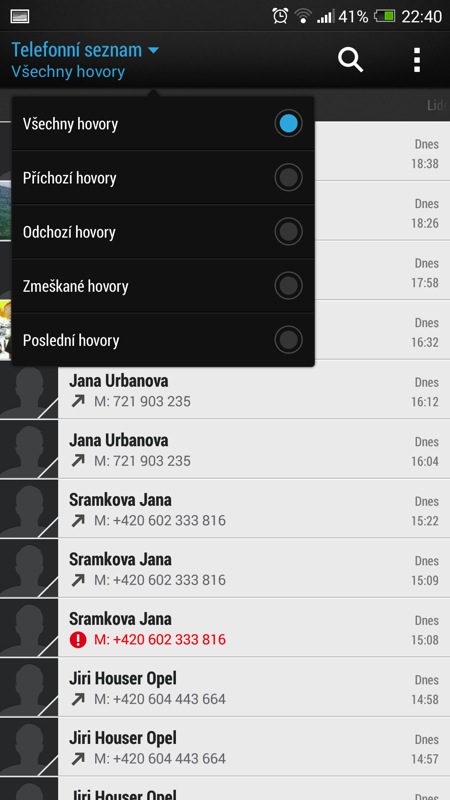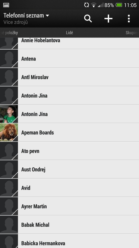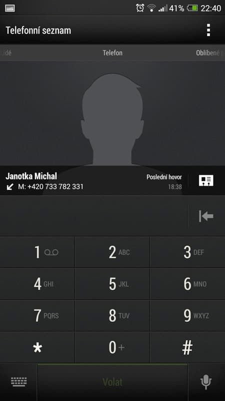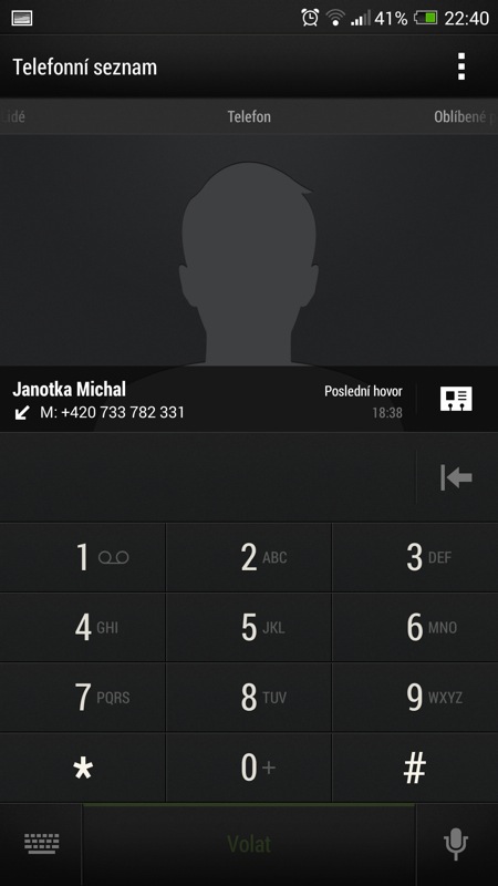 Pokud znáte jakýkoli telefon s Androidem, podoba telefonního seznamu vás nejspíše nepřekvapí. Jedná se o aplikaci, ve které se nachází jak seznam samotný, tak i výpis všech uskutečněných hovorů nebo alfanumerická klávesnice. Ta umí vyhledávat kontakty i v režimu T9 – začněte psát jméno jako na obstarožním telefonu vašich rodičů a telefonní seznam začne prohledávat kolonky jména a příjmení. Bohužel, kolonku Firma nebo Pozice jakoby tento způsob vyhledávání neznal.