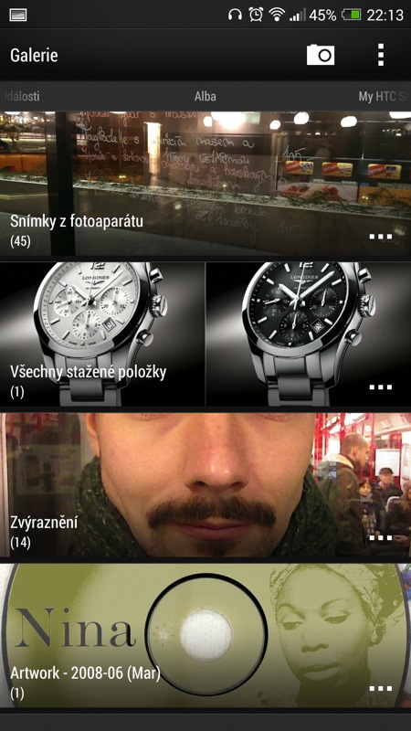 V multimediální oblasti pro mne znamenal HTC One Max obrovské zklamání – za osmnáct tisíc korun dokonce neváhám mluvit o ostudě. Ano, galerii má největší HTC moc hezkou. Jednotlivá fotoalba jsou přehledně srovnána pod sebou s velkým náhledem úvodní fotky, a když chcete, můžete se po přihlášení probírat i fotografiemi z vašich účtů na sociálních sítích a webových úložištích. To je ale na multimediální telefon sakra málo.