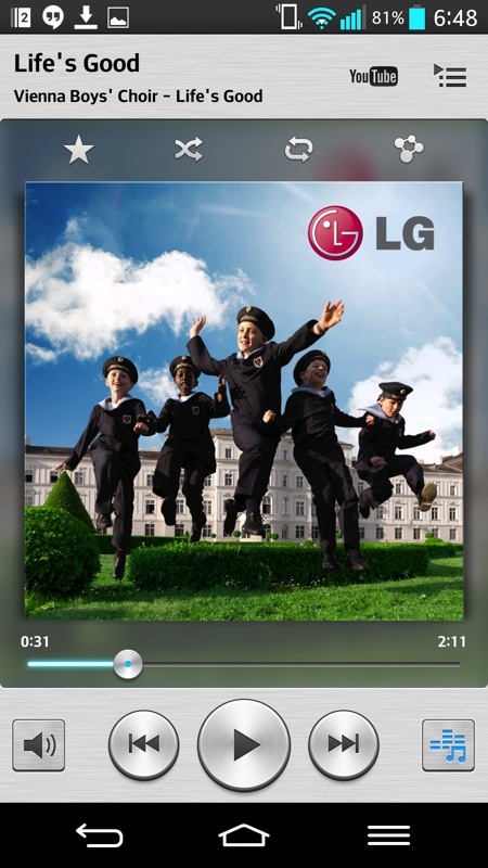 Hudební přehrávač také přináší něco navíc. Konkrétně tím je v první řadě vylepšený zvuk v Hi-Fi kvalitě, pokud v takové kvalitě je samotný audio soubor, telefon si již s ním poradí. LG G2 podporouje kromě klasických audio formátů typu MP3, WAV, eAAC+, AC3 a WMA také kvalitnější formát FLAC. V tomto formátu najdeme v telefonu přednahrátou trojici skladeb od společnosti LG, které ukazují zlepšenou kvalitu, kterou si pustíte do sluchátek. Ale posuďte sami, zhruba 2 minutový soubor má přes 50 MB, při omezené 16 GB vnitřní paměti, kdy se počítá každé MB, to asi prakticky nebude žádné velké terno. Uživatelé si možná pár nejoblíběnějších skladeb ve vyšší kvalitě do telefonu nahrají, ale mít celou svoji hudební sbírku ve FLACu by bylo na úkor dalších multimédií. Nutné je také dodat, že aby vyšší kvalita nebyla nijak pozměněna, není dokonce dovoleno používat ekvalizér, který jinak u LG G2 je k dispozici.