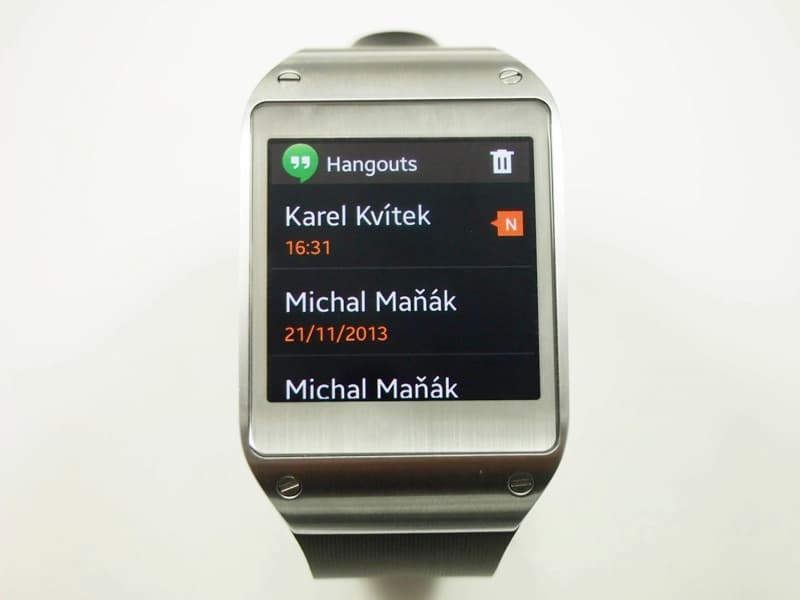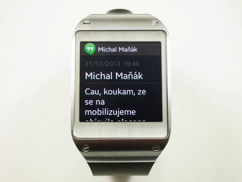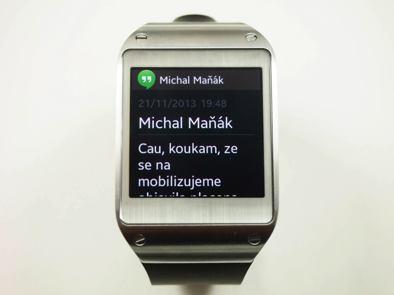 Jak jsem již na začátku recenze nastínil, Samsung před nějakým týdnem uvolnil významnou aktualizaci, která z prakticky nepoužitelných hodinek v oblasti notifikací udělala naopak jedny z těch lepších. Takže pokud vám dorazí ať už SMS zpráva, konverzace na Hangouts, nové emaily či třeba i zprávy na sociálních sítích (Facebook, Google+, Twitter), vše se vám krásně zobrazí v podobě krátké notifikace přes celý displej. V nastavení si můžete odfiltrovat, co vše chcete dostávat za upozornění a co nikoliv. Prakticky můžete mít všechna upozornění z telefonu přímo v Galaxy Gearech, omezení se zde již nekladou.