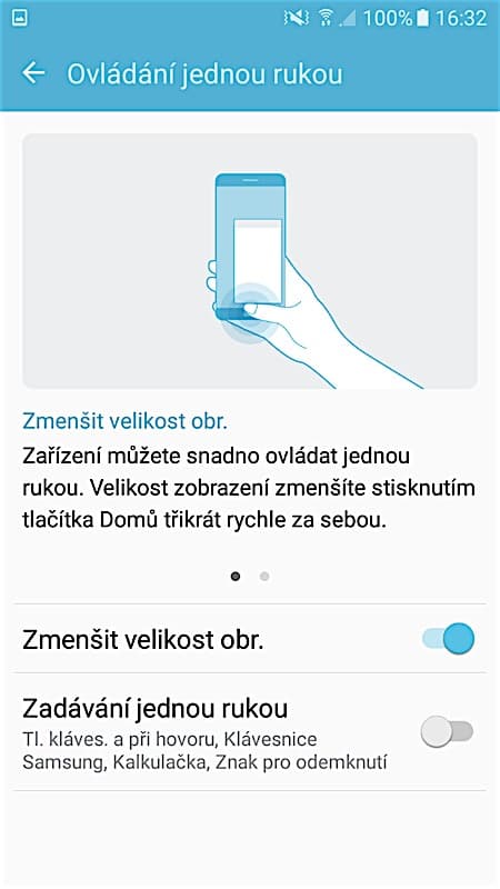 Větší rozměry už mohou pro některé uživatele znamenat trochu oříšek, pokud jde o držení a ovládání telefonu v jedné ruce. Samsungu se ale povedlo vyrobit takový telefon, který se příjemně drží a z ruky jen tak nevyklouzává. Pokud byste přeci jen měli problémy s ovladatelností, můžete si trojitým stisknutím domovské klávesy pod displejem aktivovat jednoruční režim, kdy dojde k praktickému zmenšení funkční části obrazovky.
