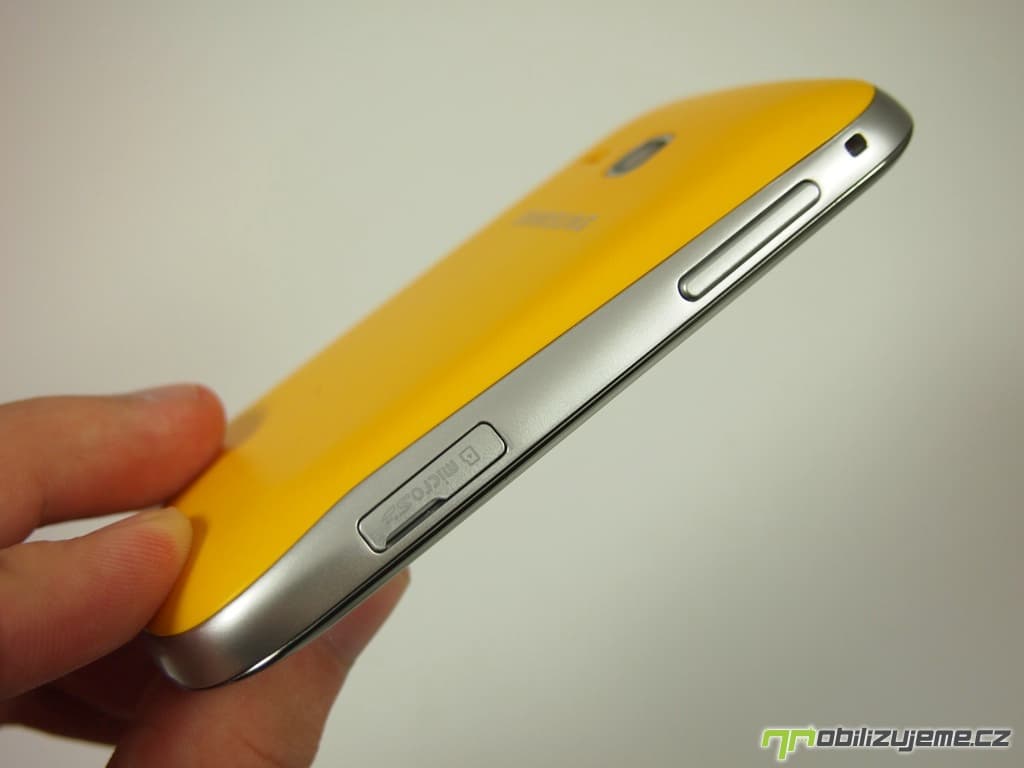 Tlačítko pro regulaci hlasitosti, zdířka pro uchycení na poutko a prakticky umístěný slot pro microSD karty se nachází na levém boku. Na pravém boku je to pak pouze tlačítko pro zamknutí/odemknutí telefonu.