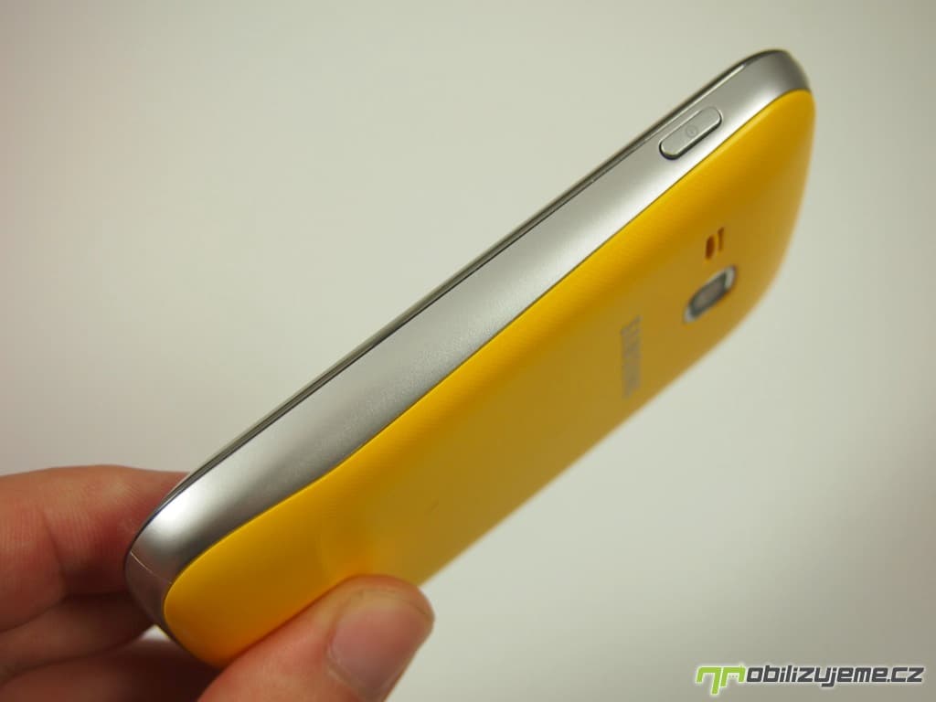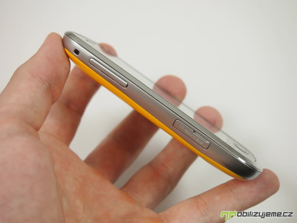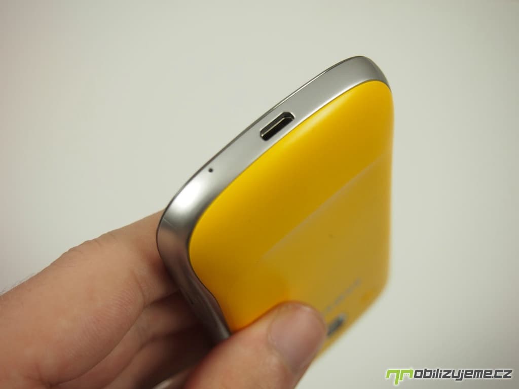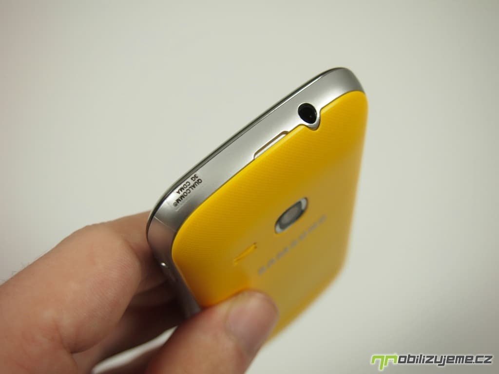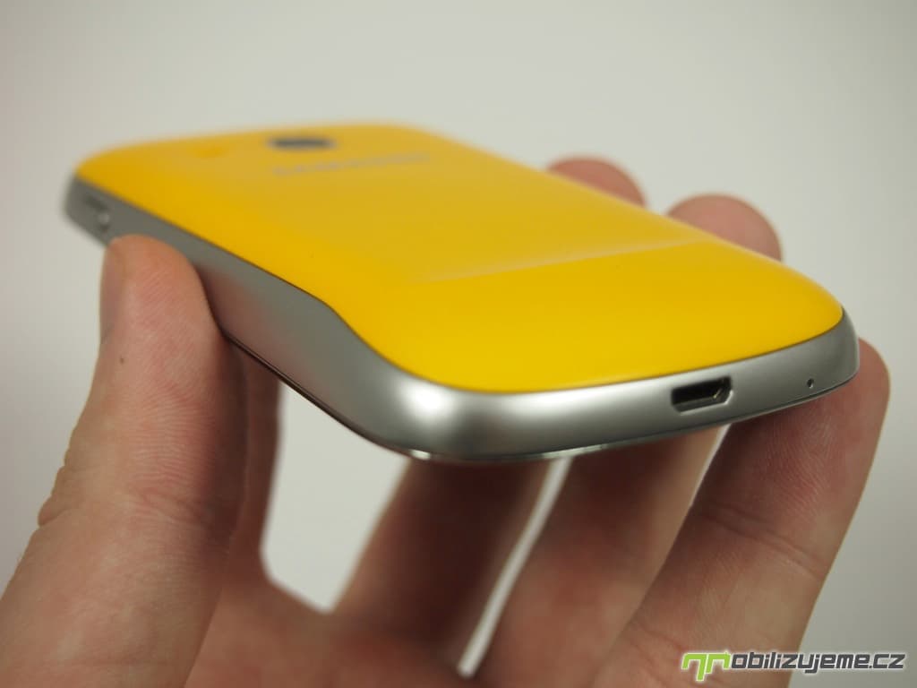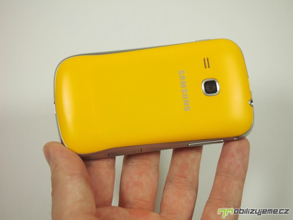 Zaoblené rohy, stříbrná lišta kolem celého těla imitující kov, jedno hardwarové a dvě senzorová tlačítka pod displejem, prostě na první pohled vypadá Galaxy Mini 2 jako každý druhý smartphone od Samsungu. Zaujme snad pouze netradičním žlutým zadním krytem, který dodává telefonu na „originalitě“.