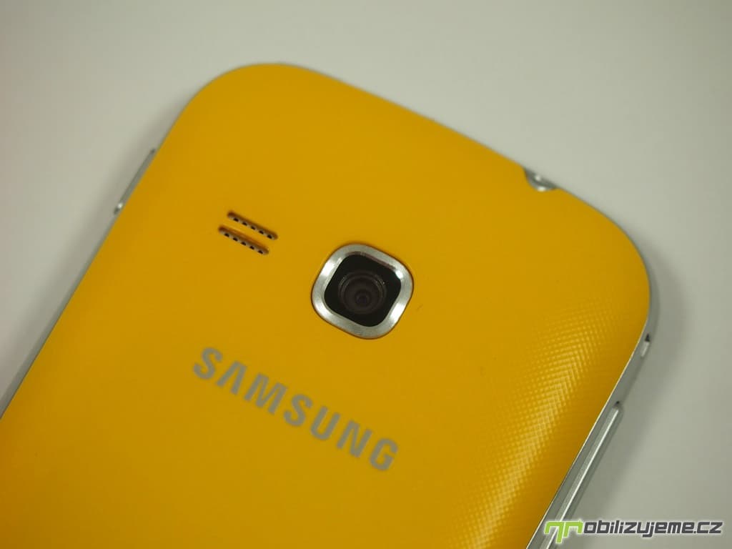 Na zadní straně najdeme čočku 3 Mpx fotoaparátu, otvor pro hlasitý reproduktor a opět logo Samsung. Pod zadním krytem je pak ještě umístěna NFC anténa.