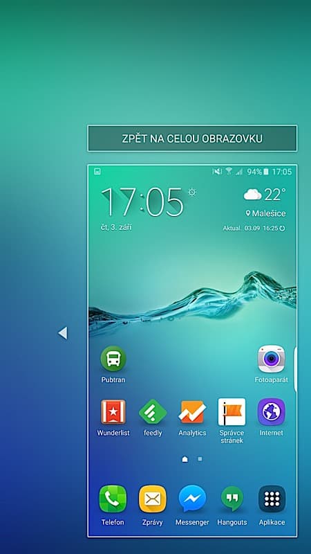 Abychom nezapomněli, S6 Edge Plus nám oproti klasickému S6 Edge pěkně narostl. Měří již 154 x 76 x 6,9 mm a má o 0,6 palců větší displej, tedy 5,7 palců. Hmotnost se však u něj přesto stále drží výtečných 153 gramů, což je na telefon phabletových rozměrů, navíc v kombinaci s použitím kovu, naprosto výborný výsledek. Přesto si Samsung dovolil jít vstříc lidem, kteří by s ovládáním takto většího telefonu již mohli mít problémy a po trojitém stisknutí domovské klávesy tak dojde k praktickému zmenšení funkční části displeje.