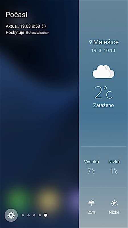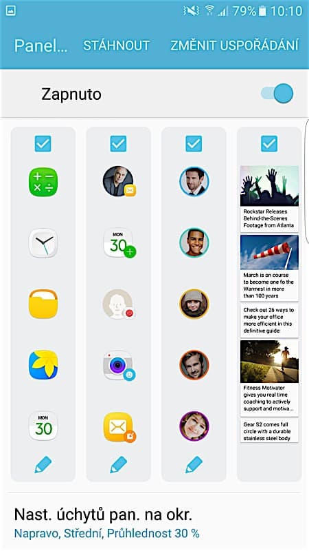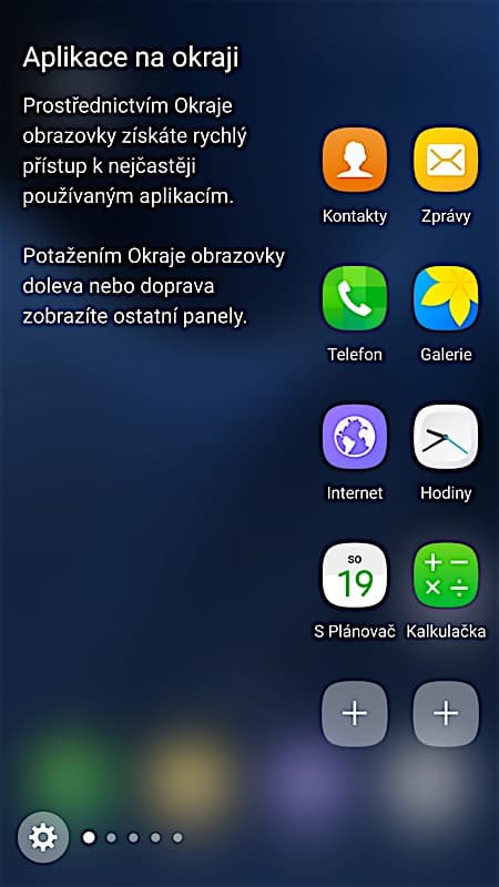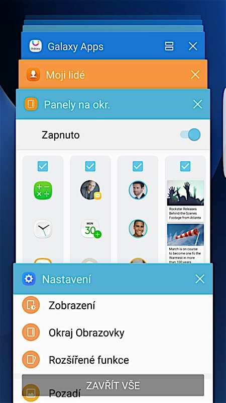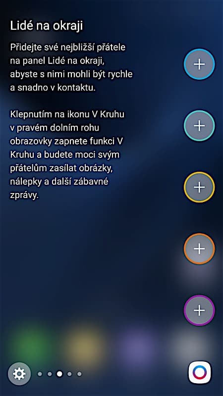 Zvyknout jsem si nemohl ani na jedno z nejdůležitějších využití zahnutého displeje. Grafická nadstavba TouchWiz disponuje navíc prvkem, kterému Samsung říká Edge UX. Z pravého okraje lze vysunout lištu s rozlišným využitím. Buď na ni vidíte oblíbené kontakty, nebo třeba předpověď počasí. Ale to zdaleka není vše. V základu nabídne Galaxy S7 15 možných vzhledů lišty včetně kompasu, seznamu záložek v prohlížeči, nebo třeba nastavení zautomatizovaného chování telefonu v určitých situacích a na určitých místech. K tomu všemu si ale můžete nové funkcionality stáhnout z obchodu s aplikacemi a vše rázem dostává ještě nový smysl. Vysunout totiž budete moci i tabulku s rychlými přepínači nebo seznam všech přijatých SMS. To už může práci s telefonem výrazně zrychlit. Stejně tak jako užitečná funkce Moji lidé, kdy v případě, že s vámi začne komunikovat někdo ze seznamu oblíbených kontaktů, vyskočí na okraji displeje barevná záložka, která vás o tom informuje a rychle se tak ke zmíněné konverzaci dostanete.