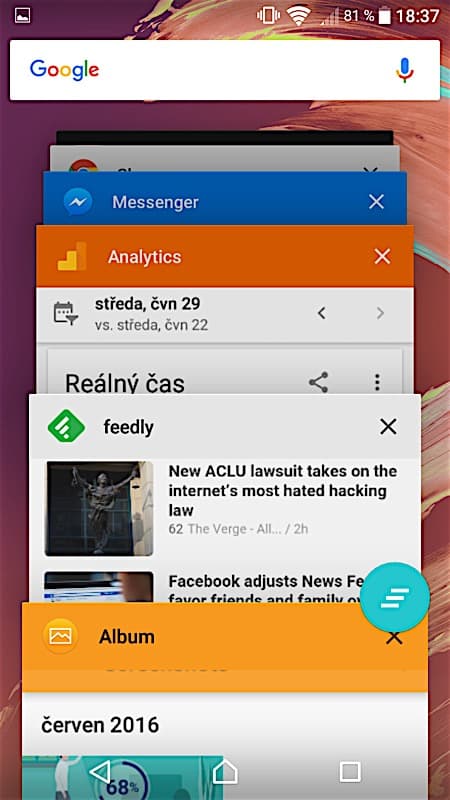 Prostředí od Sony staví na stále ještě nejnovějším Androidu 6.0 Marshmallow. Změnou ale prošla odemykací obrazovka, která podporuje trojici swipe gest – pro odemknutí přejedete prstem zprava doleva nebo odspodu nahorů, pro zobrazení veškerých notifikací pak stačí přejet prstem odshoda dolů. A swipe gesto můžete použít dokonce i na domovské obrazovce – přejetím odshora dolů se dá začít vyhledávat ze seznamu aplikací, případně najít aplikaci na Google Play. Škoda, že výrobce nepřinesl rovnou i další gesta, například pro stažení notifikační lišty, jako třeba u telefonů Xiaomi.